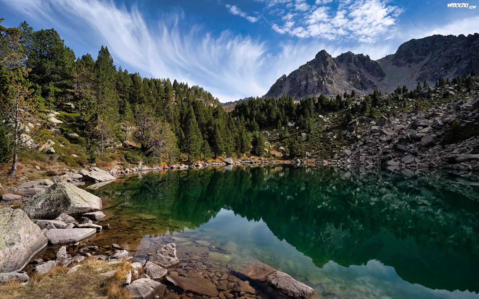 Zdjęcia, Andora, Pireneje, Estany Moreno, Góry, Kamienie, Jezioro, Las, Drzewa, Niebo, Chmury
