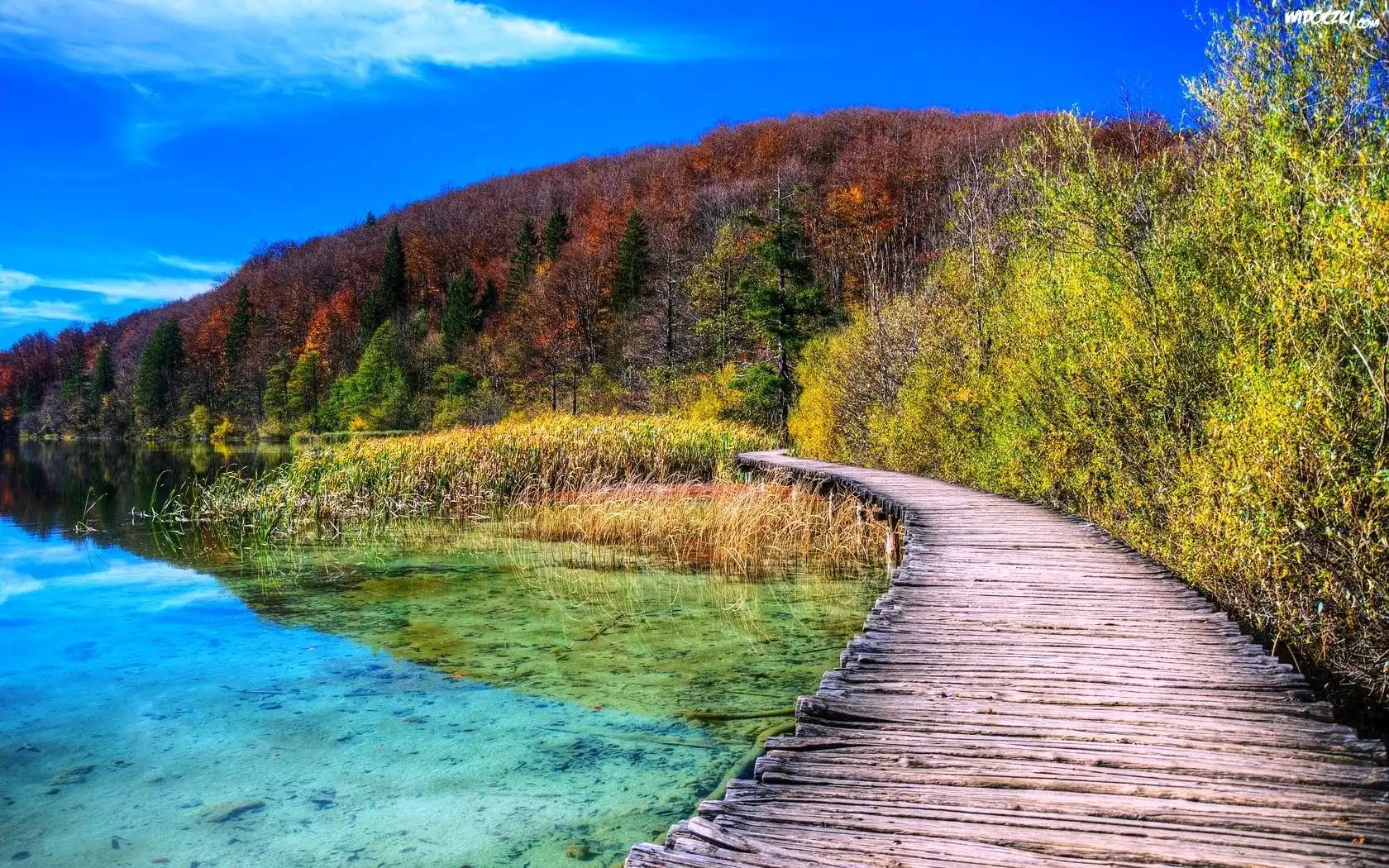Mostek, Sznur, Jezioro Góry, Jezioro, Palmy Góry, Staw Jesień, Las, Kamyki Góra, Jeziora Góra, Jeziora Las, Gwieździste, Niebo Jezioro, Sepia Chata, Jezioro, Drzewa Chmury, Góry, Jezioro Bożków, Jezioro Las, Przenikające swiatło Las, Drzewa, Przebijające, Słońce Las, Żółte, Liście, Słońce