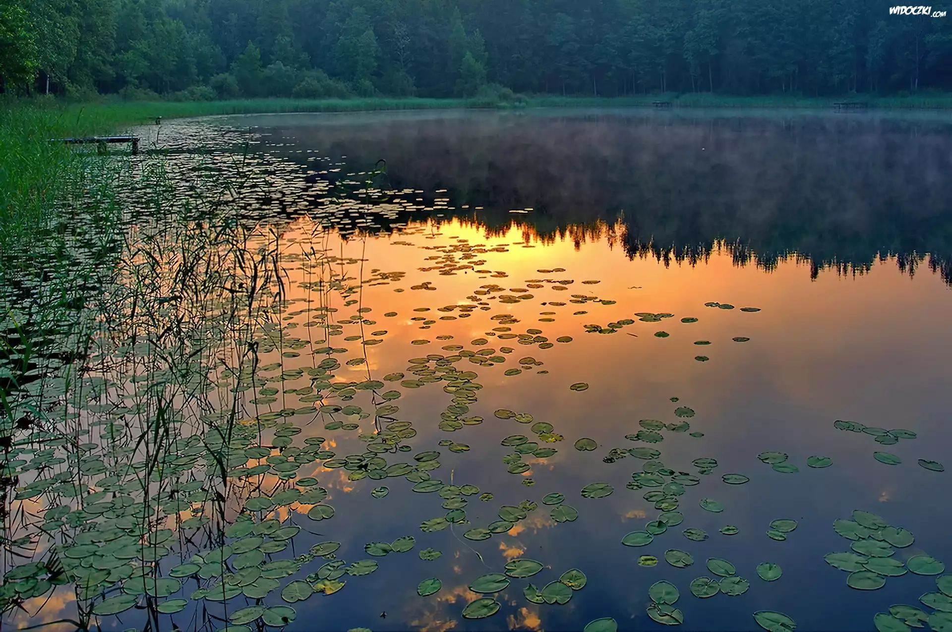 Zdjęcia, Jezioro, Las, Trawy, Liście, Zachód, Słońca, Odbicie
