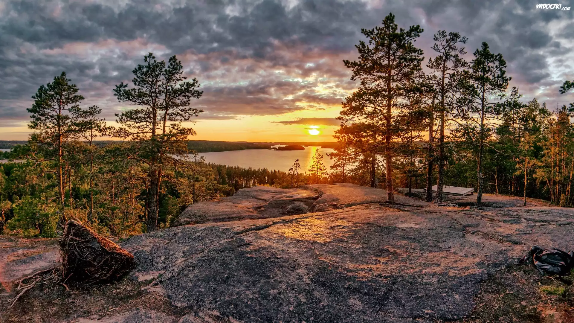 Zdjęcia, Jezioro, Las, Drzewa, Skały, Chmury, Zachód słońca