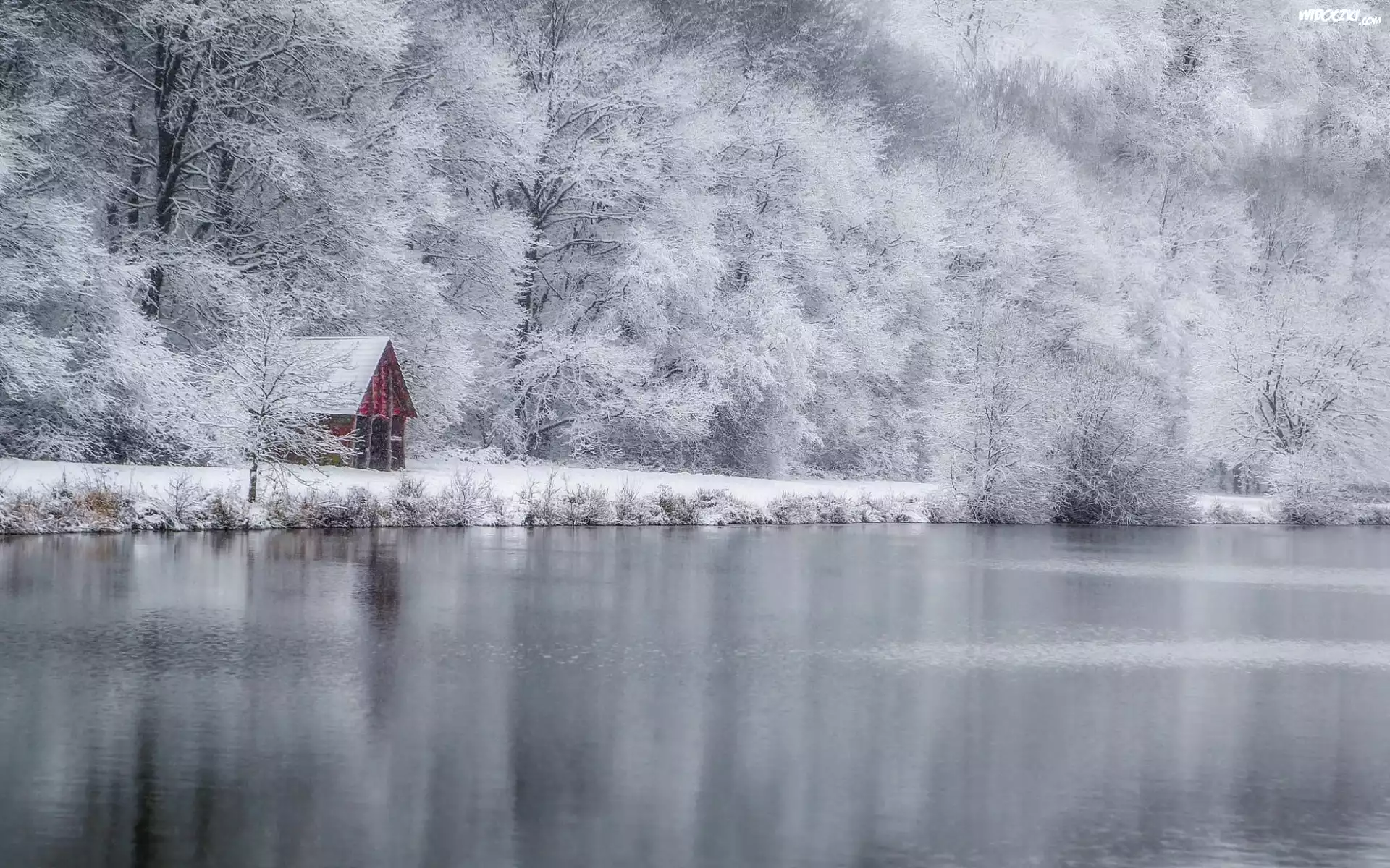 Zima, Las, Ośnieżone, Drzewa, Szron, Dom, Śnieg, Jezioro