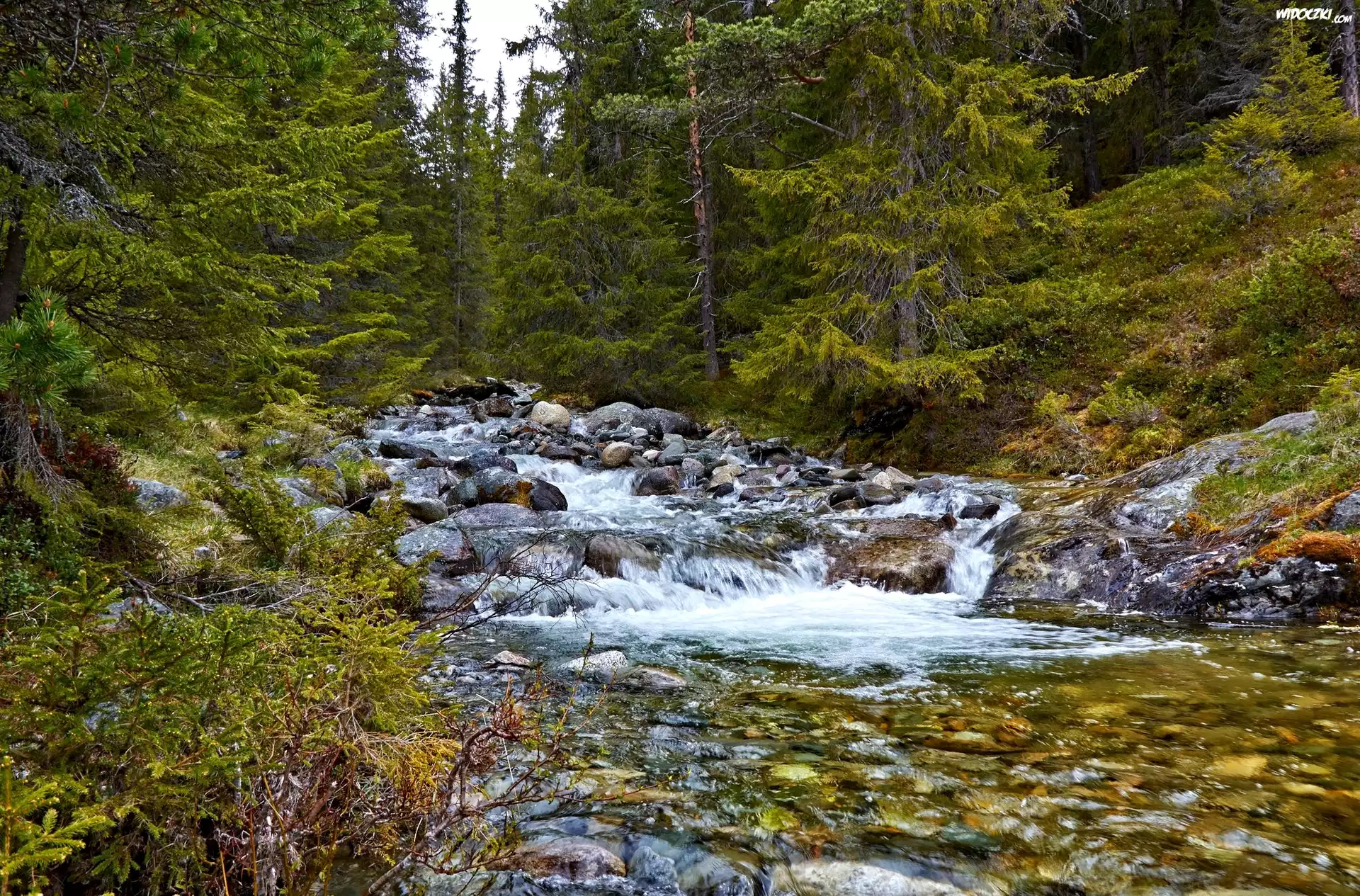 Zdjęcia, Las, Drzewa, Kamienie, Rzeczka