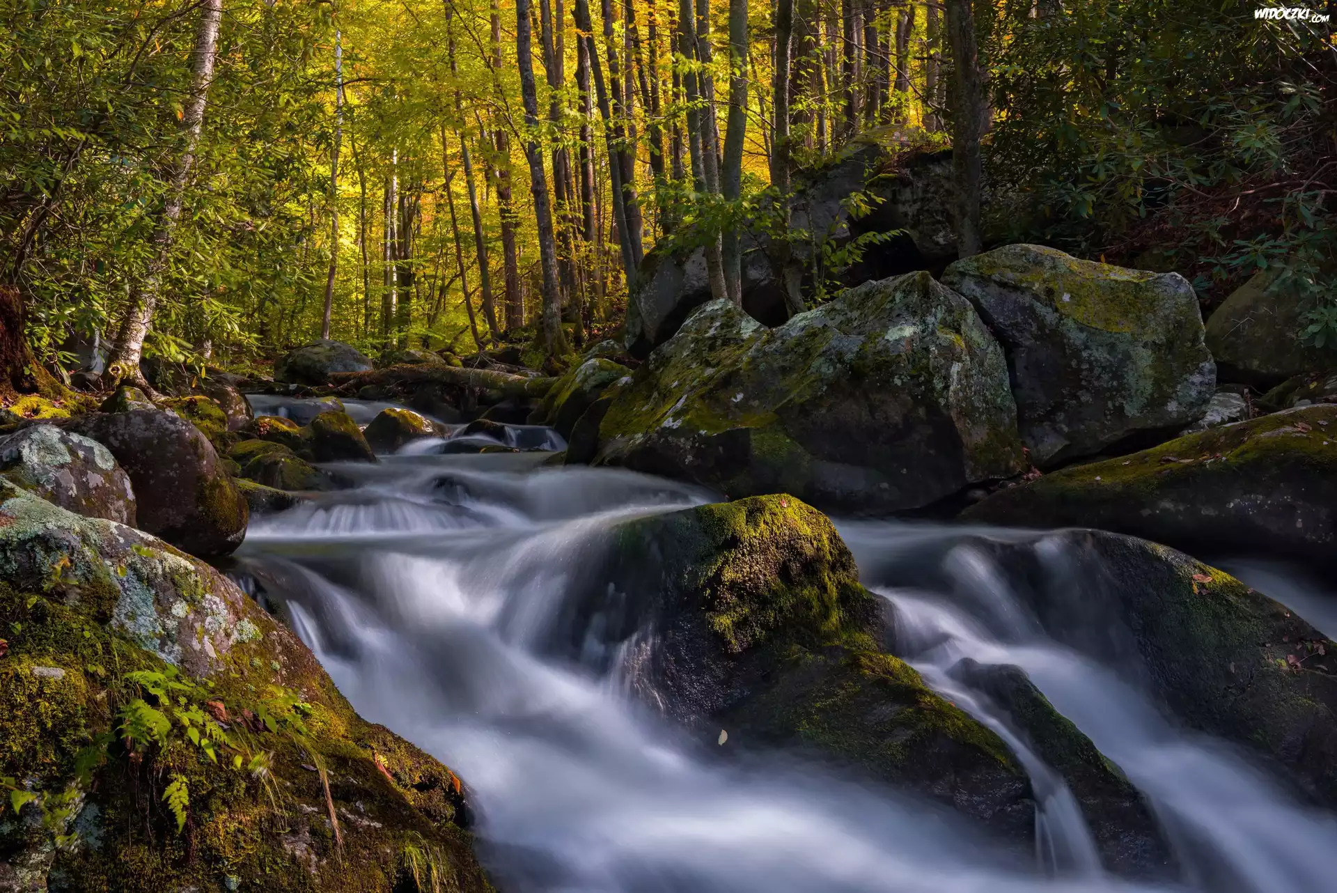 Zdjęcia, Las, Drzewa, Kamienie, Rzeka