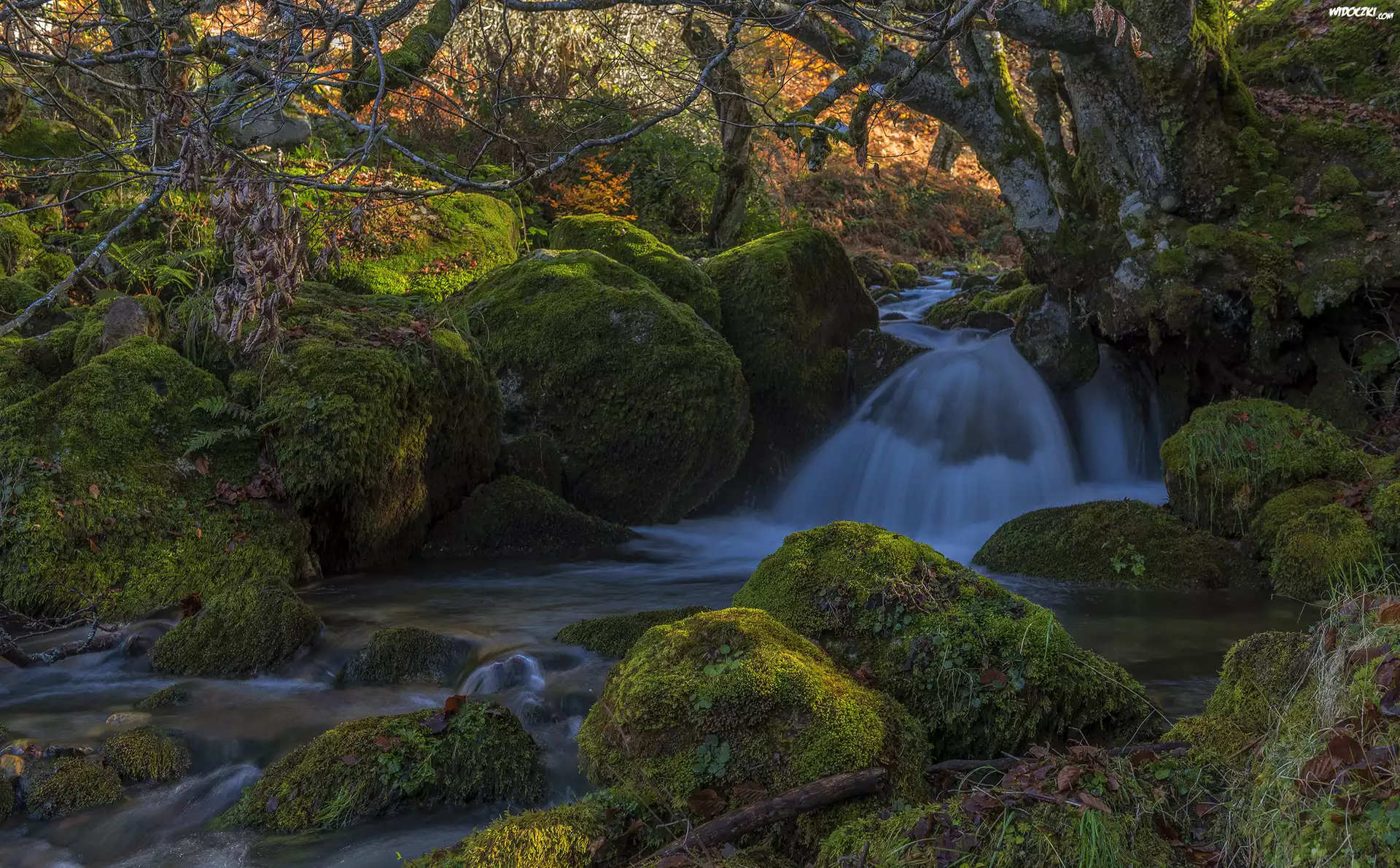 Las, Drzewa, Omszałe, Kamienie, Rzeka