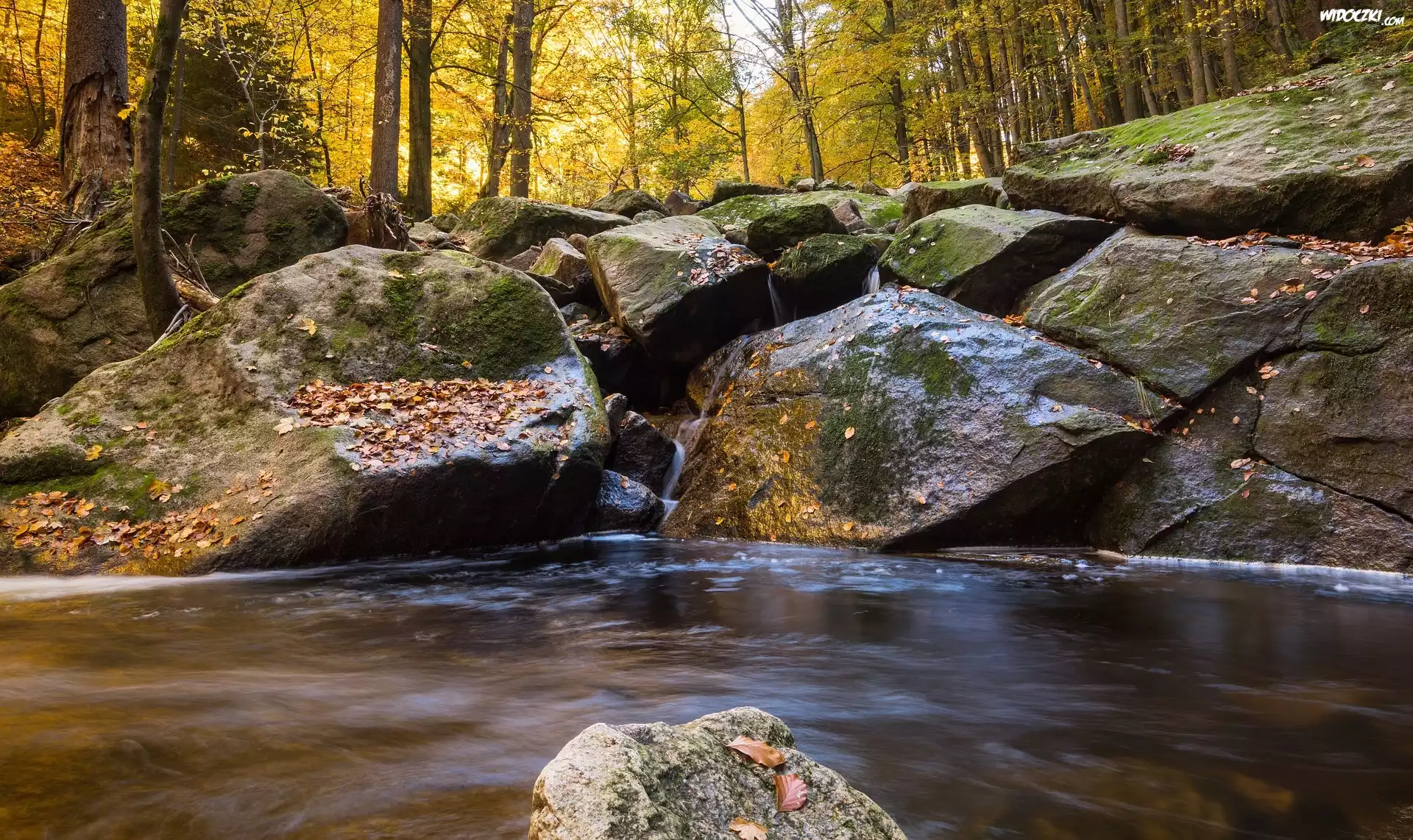 Zdjęcia, Las, Drzewa, Rzeka, Kamienie, Głazy