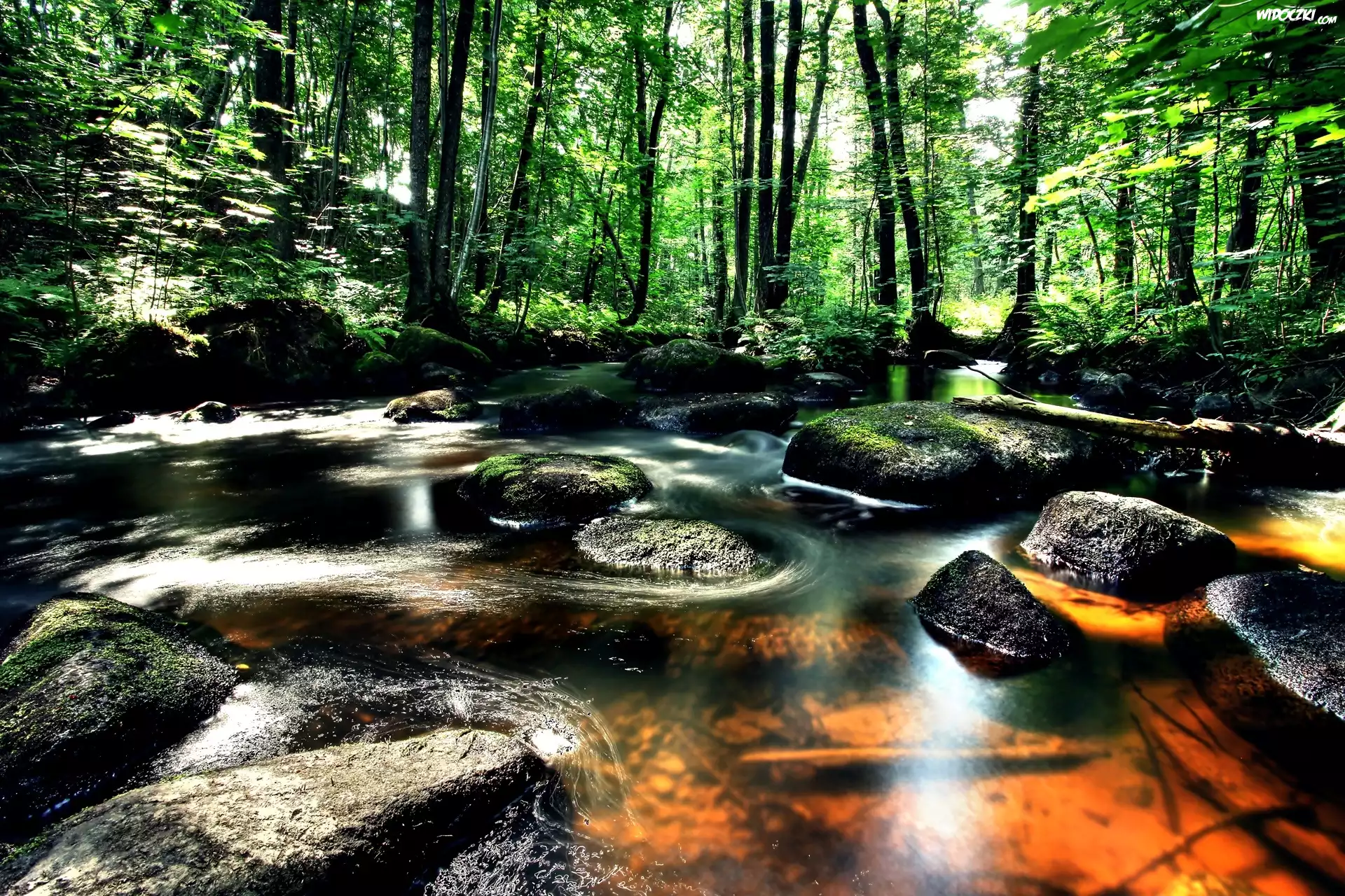 Zdjęcia, Las, Rzeka, Kamienie, Drzewa