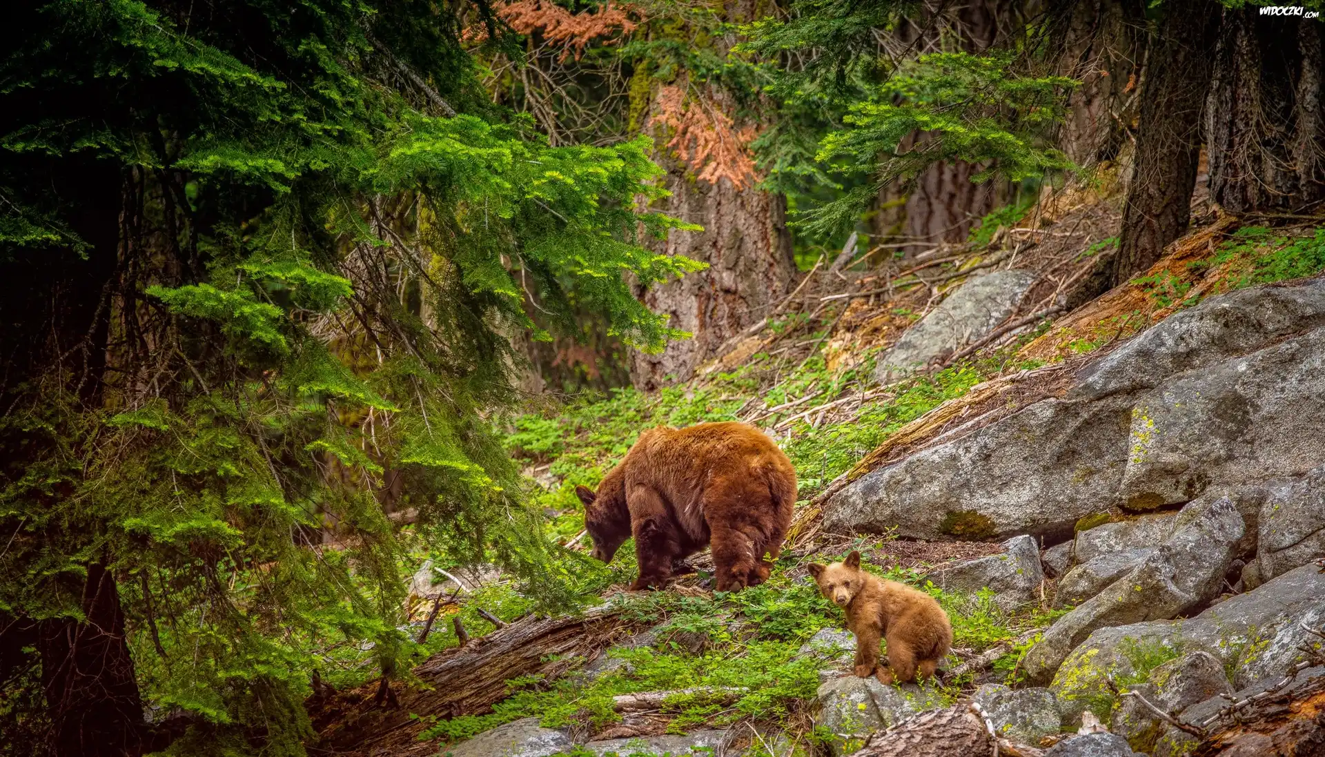 Zdjęcia, Las, Drzewa, Skały, Kamienie, Niedźwiedzie