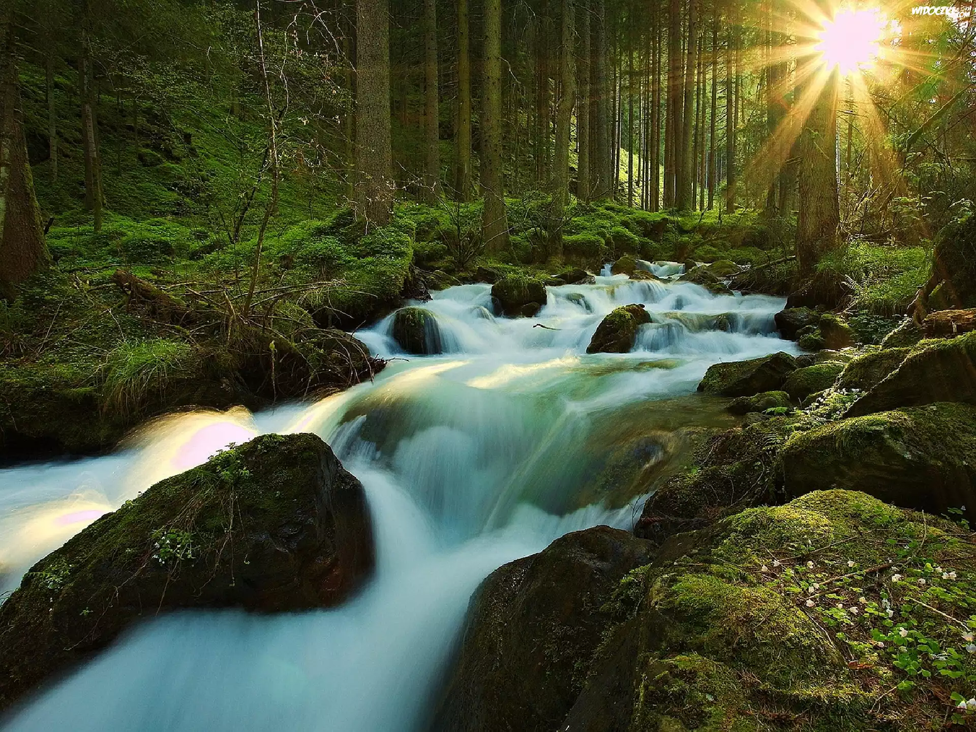 Las, Promienie, Słońca, Kamienie, Strumyk