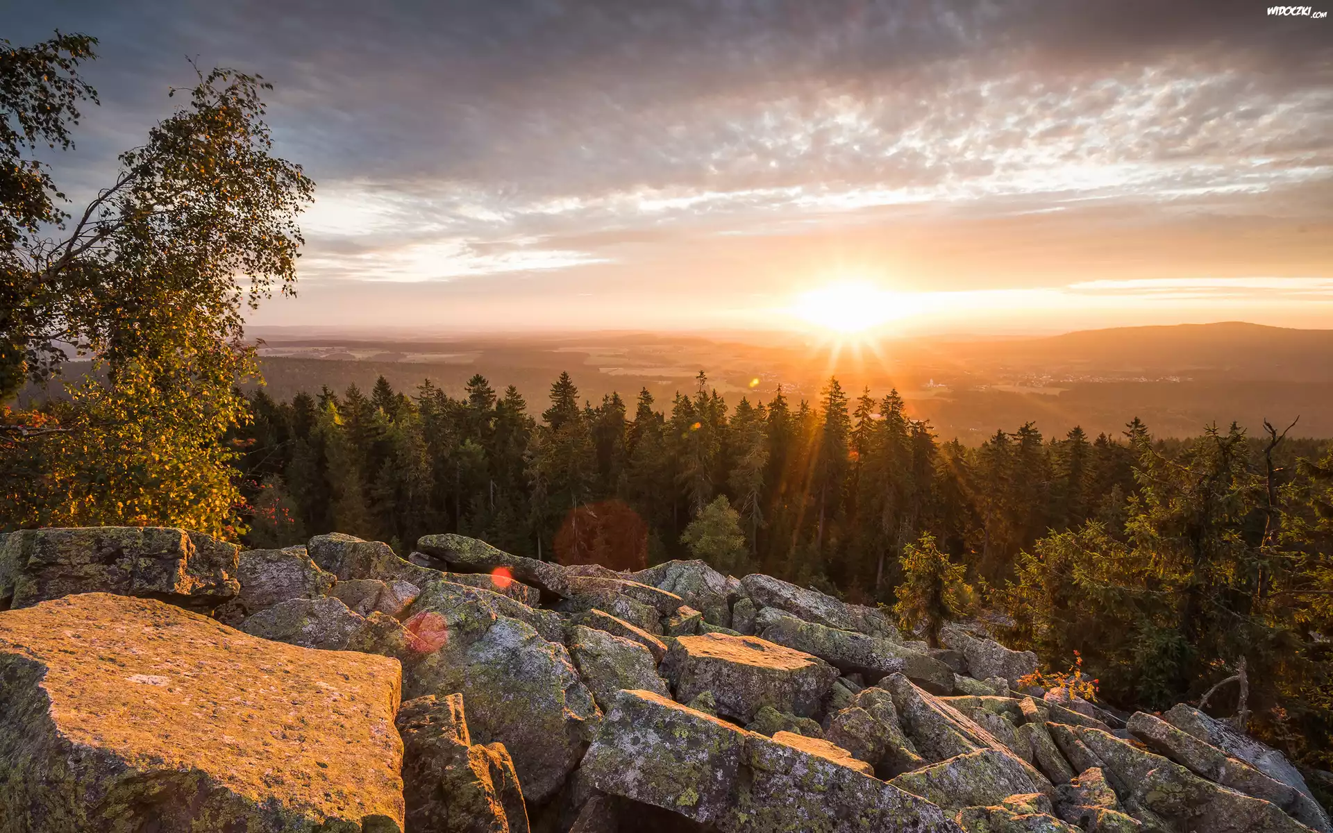 Zdjęcia, Las, Wschód słońca, Kamienie, Drzewa