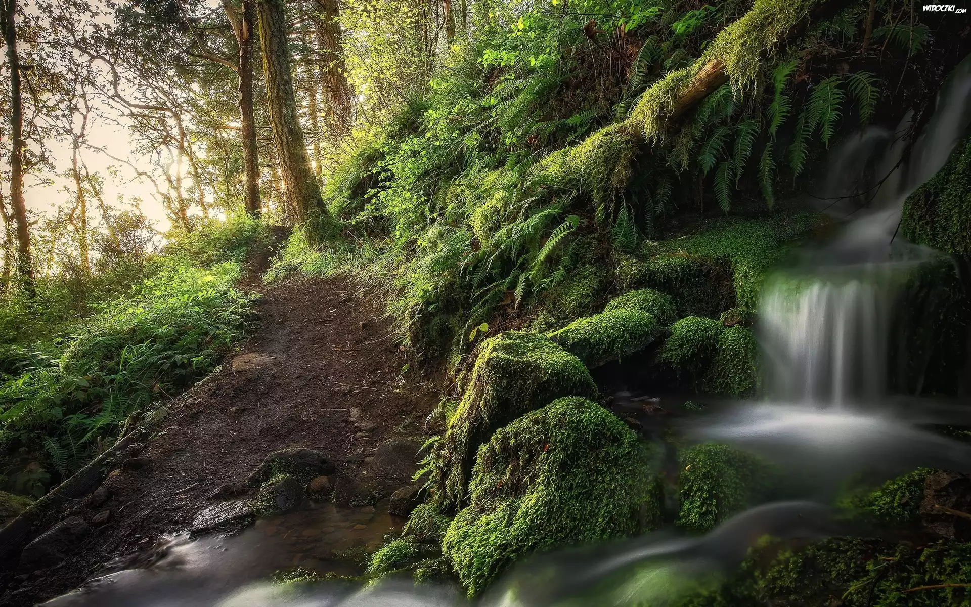 Las, Ścieżka, Wodospad, Kamienie, Mech