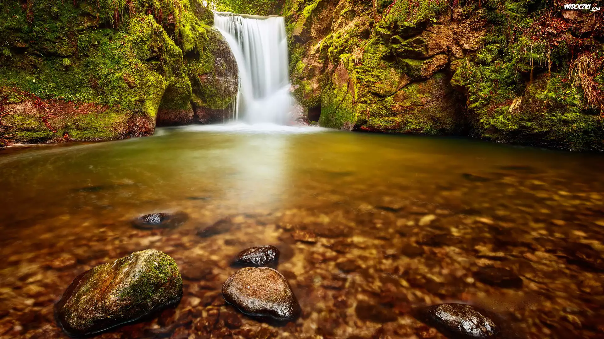 Wodospad, Chmury Wodospad Wodospad Jesie艅 Kormoran, Kamienie, Zach贸d, S艂o艅ca, Ocean, Mg艂a Wisona, Las Kamienie, Morze Las, Chmury Las, Mech, Bagno Las, Mostek, Drzewa Krajobraz, Las, Drzewa, Mech, Trawa Wodospad Drzewa Kamienie, Morze, Chmury Wodospad, 艂膮ka Las, Drzewa, Mg艂a