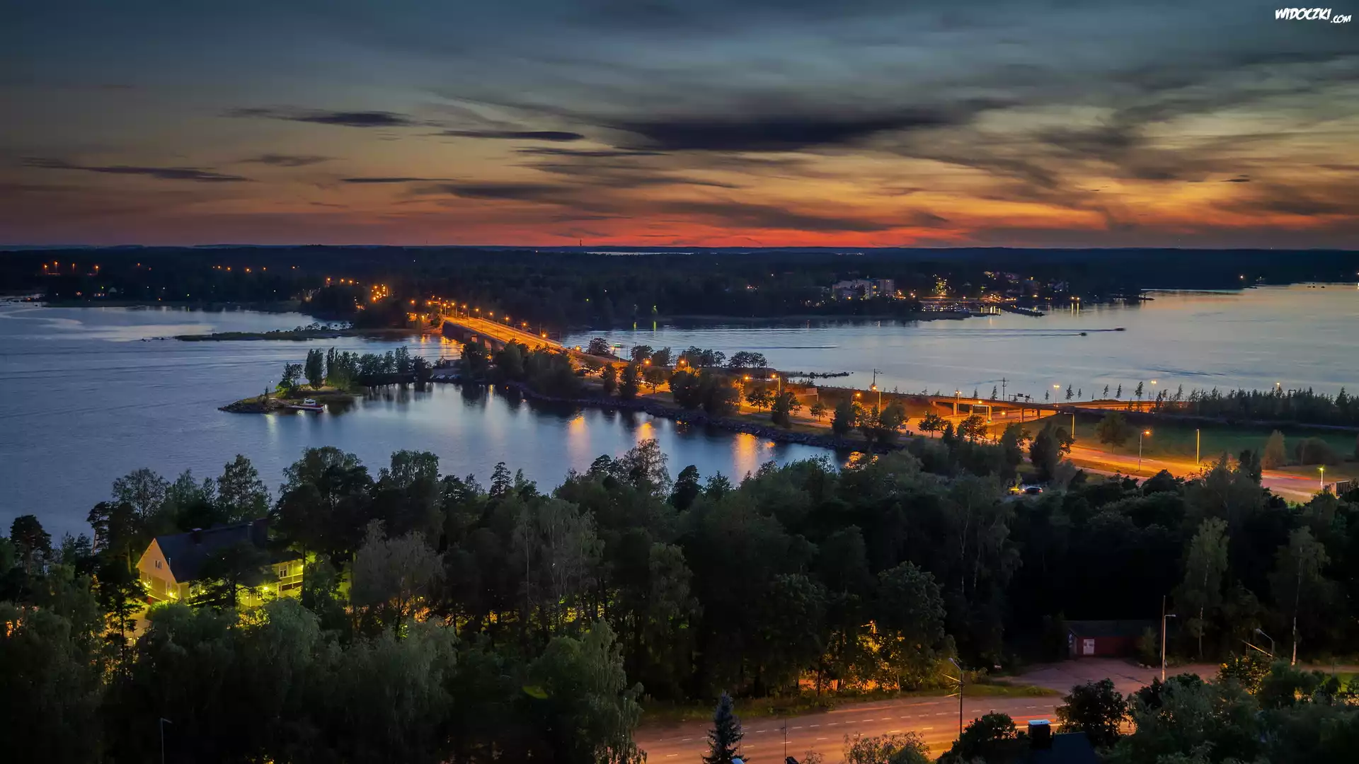 Las, Drzewa, Domy, Droga, Most, Oświetlenie, Wschód słońca, Morze, Zatoka Fińska, Wyspa Norssaari, Kotka, Finlandia |