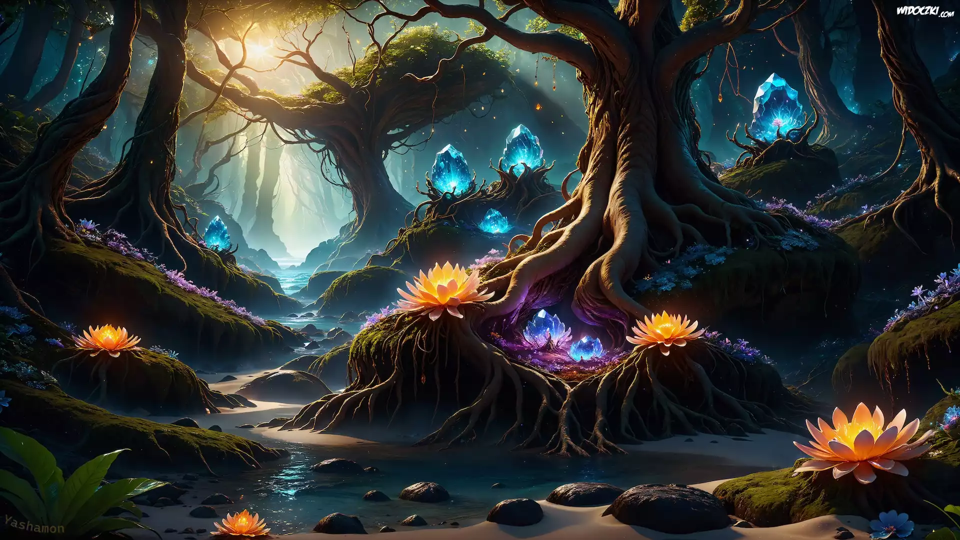 Zdjęcia, Grafika, Drzewa, Kwiaty, Lilie wodne, Przebijające światło, Las