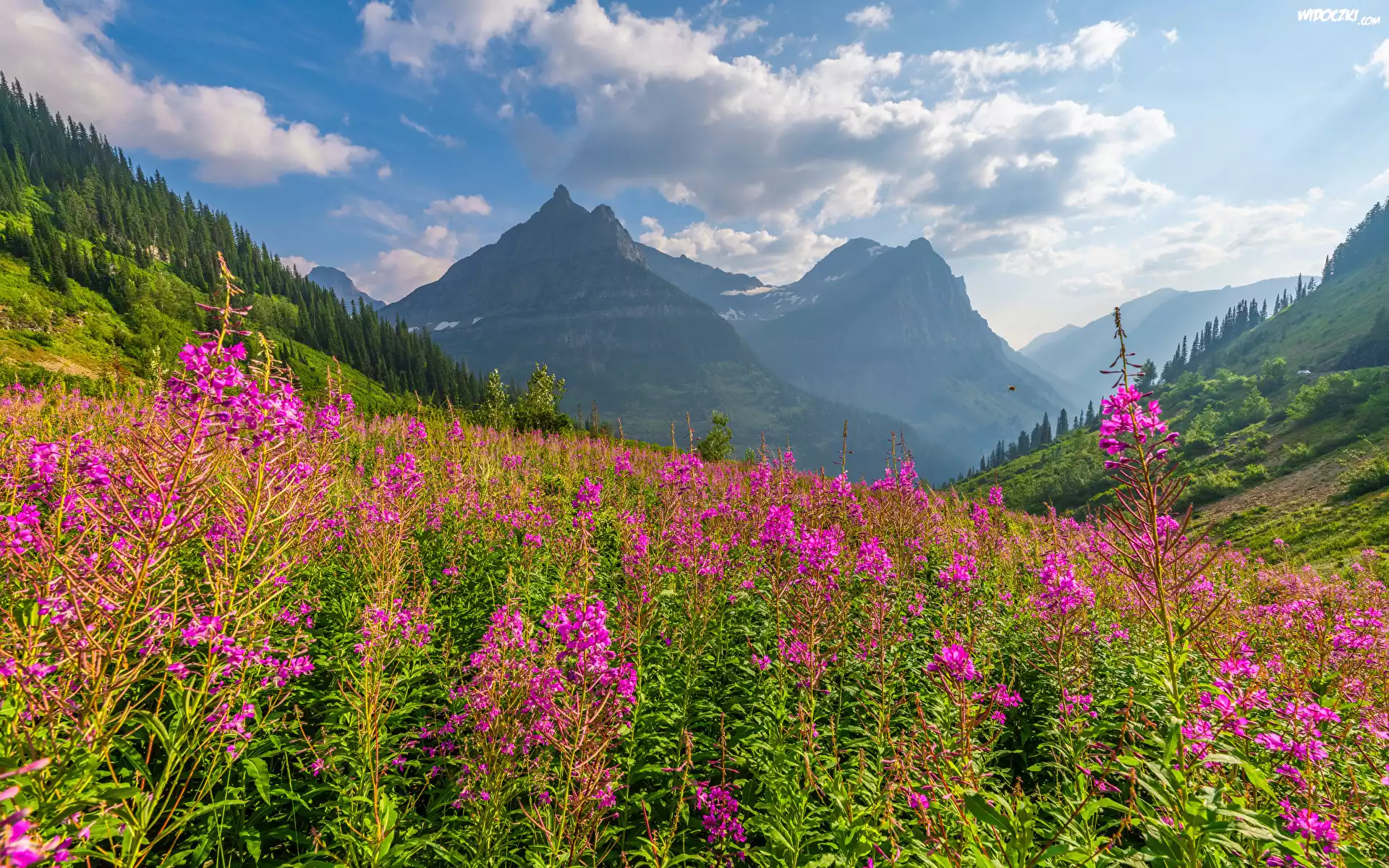 Stany Zjednoczone, Montana, Park Narodowy Glacier, Góry, Las, Drzewa, Polana, Łąka, Kwiaty, Wierzbówka kiprzyca, Chmury |