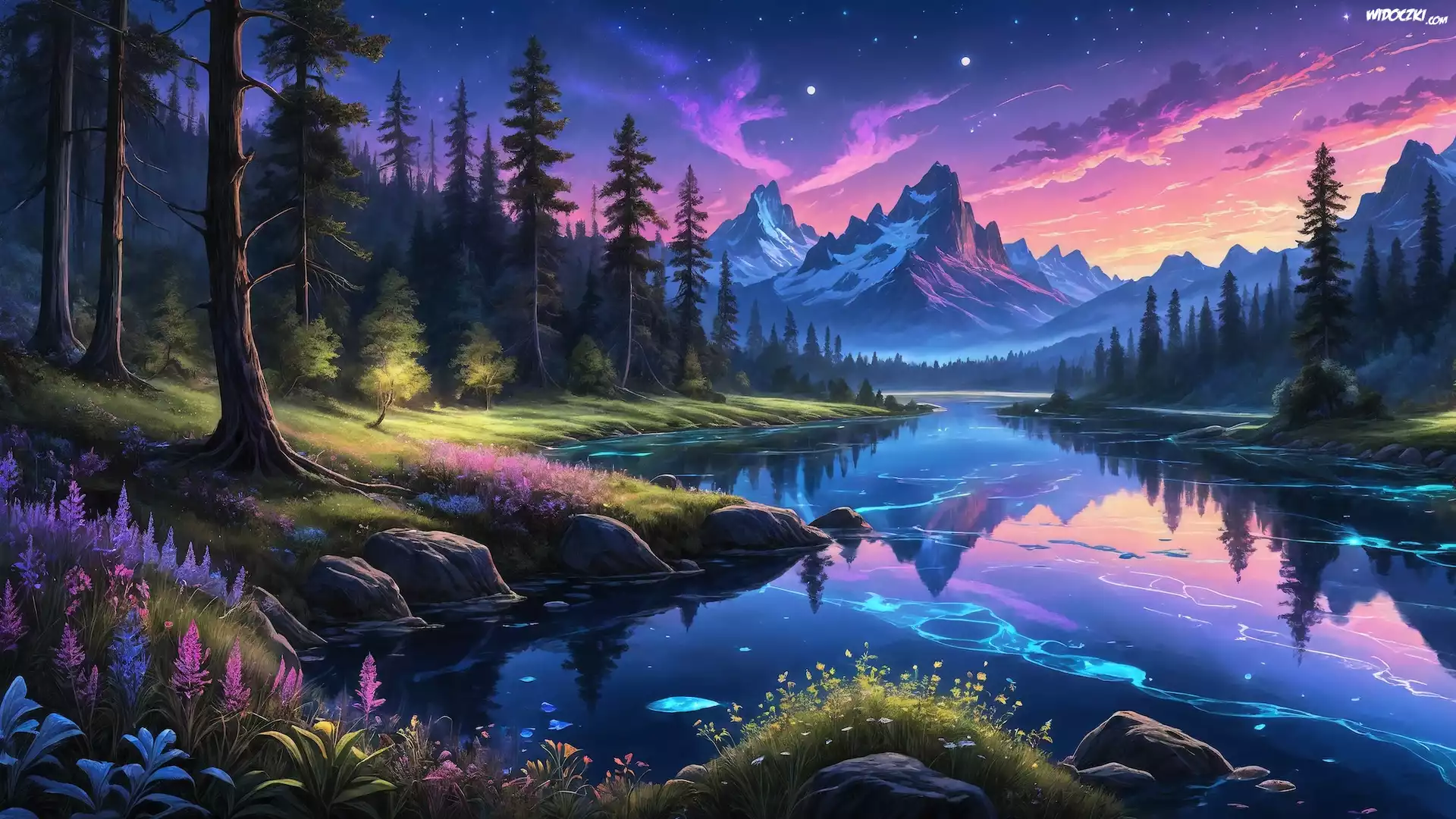 Grafika, Góry, Rzeka, Las, Drzewa, Kwiaty