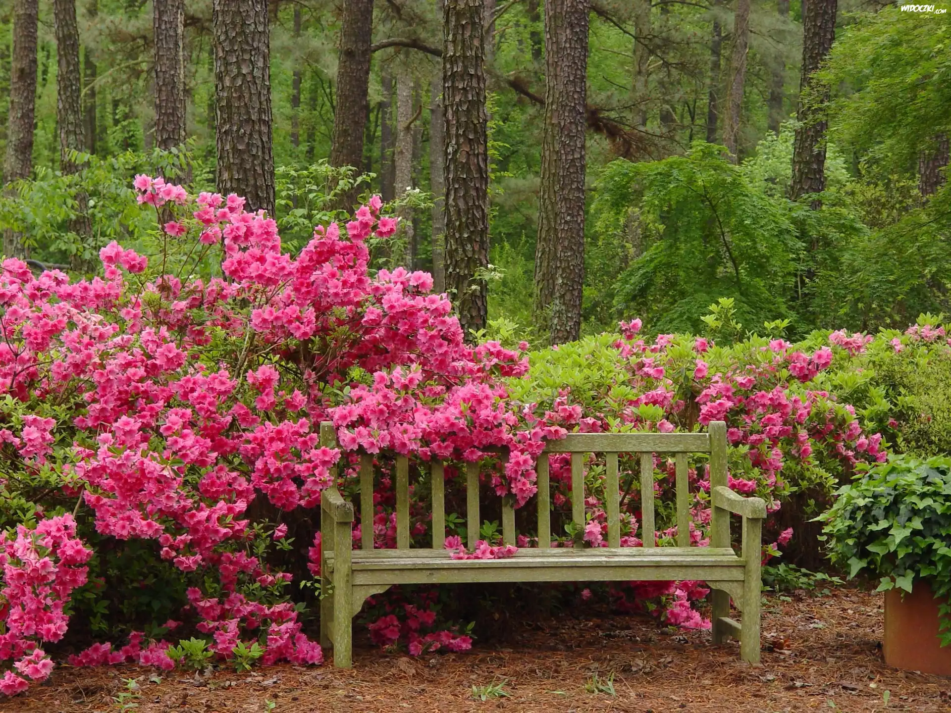 Las, Kwitnące, Krzewy, Ławeczka, Kwitnące, Rododendrony