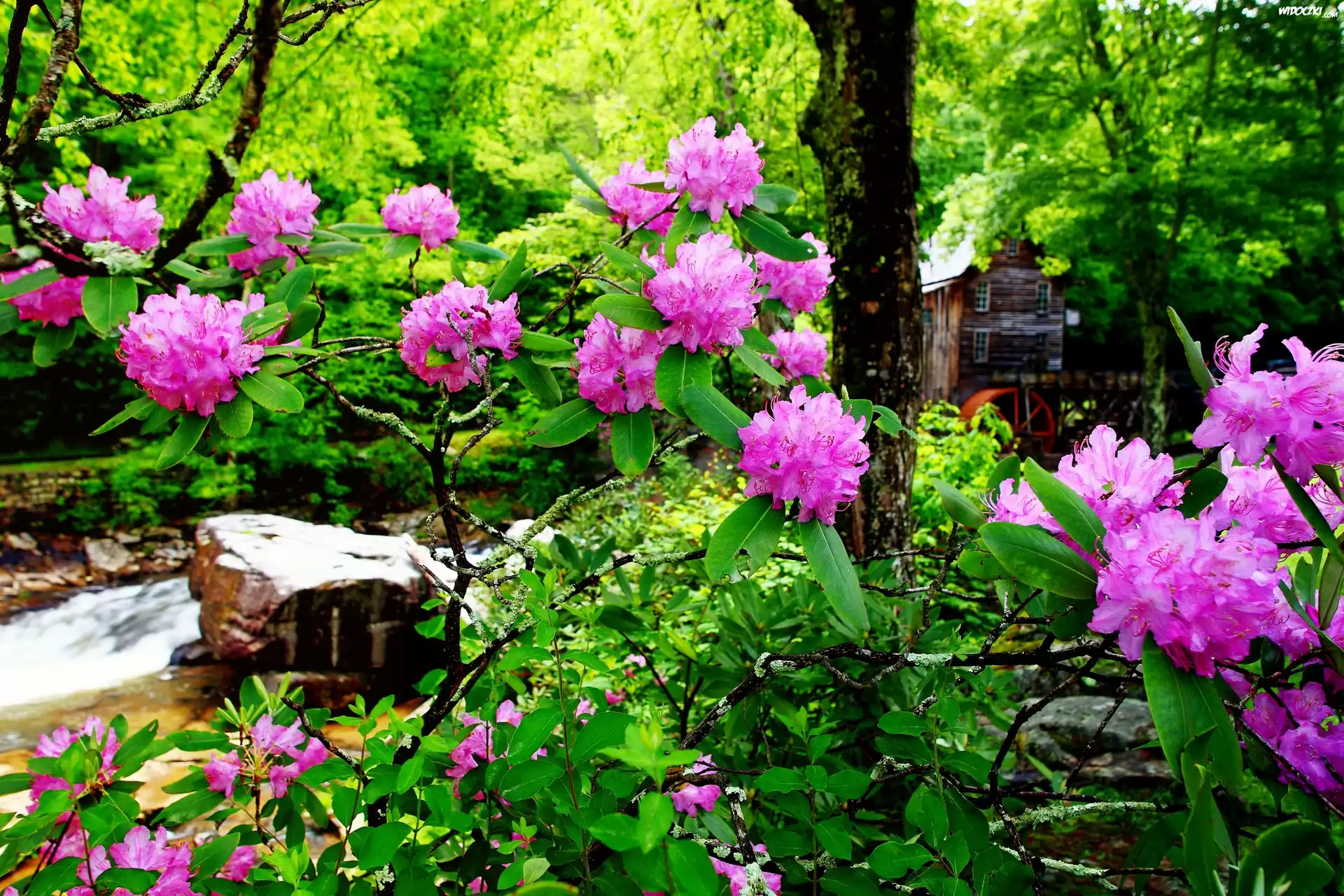 Zdjęcia, Las, Młyn, Wodny, Strumyk, Kwitnące, Rododendrony