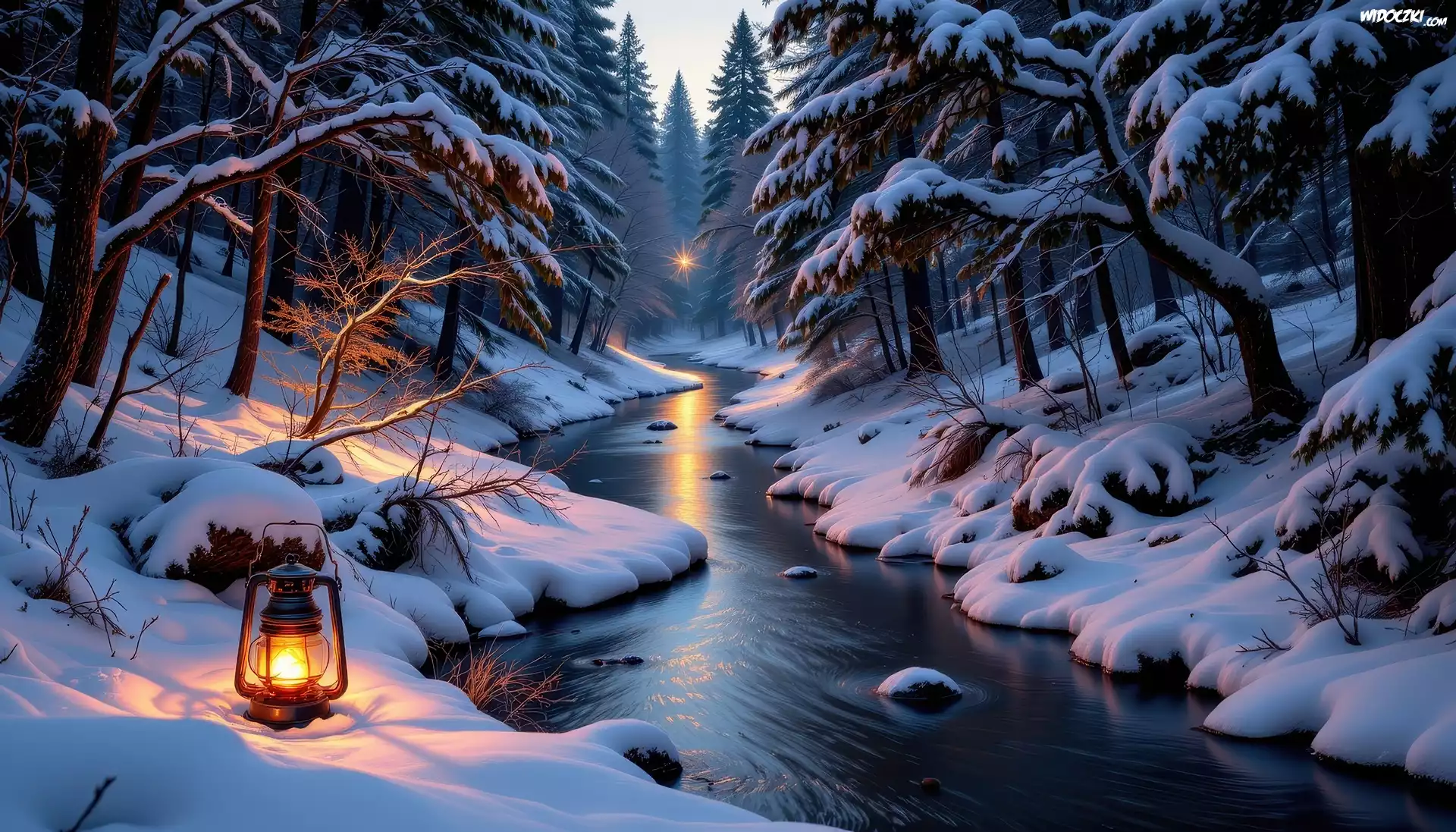 Zima, Rzeka, Lampa, Las, Drzewa, Grafika AI