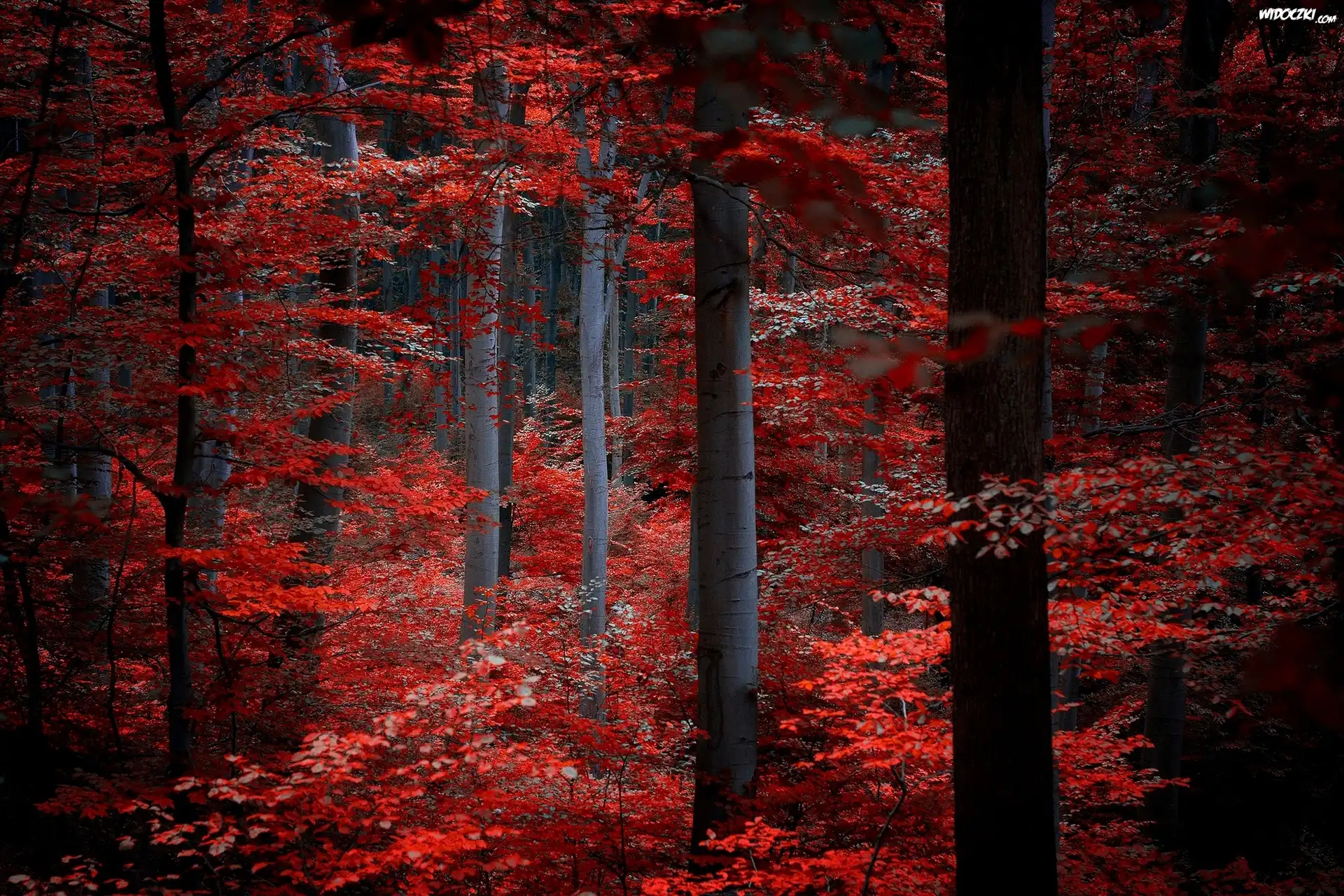 Zdjęcia, Las, Drzewa, Czerwone, Liście, Jesień