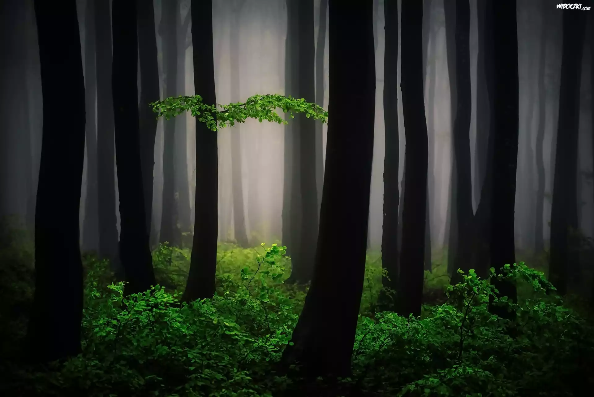 Zdjęcia, Las, Mgła, Drzewa, Zielone, Liście, Krzewy