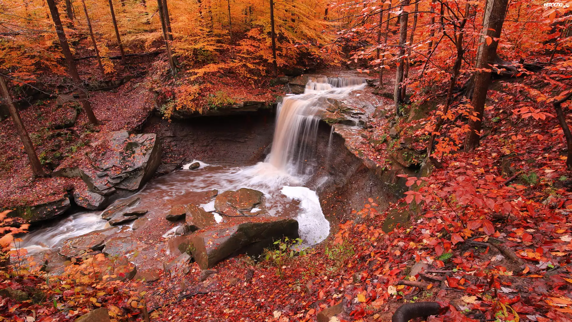 Zdjęcia, Jesień, Las, Rzeka, Skały, Wodospad, Kamienie, Czerwone, Liście