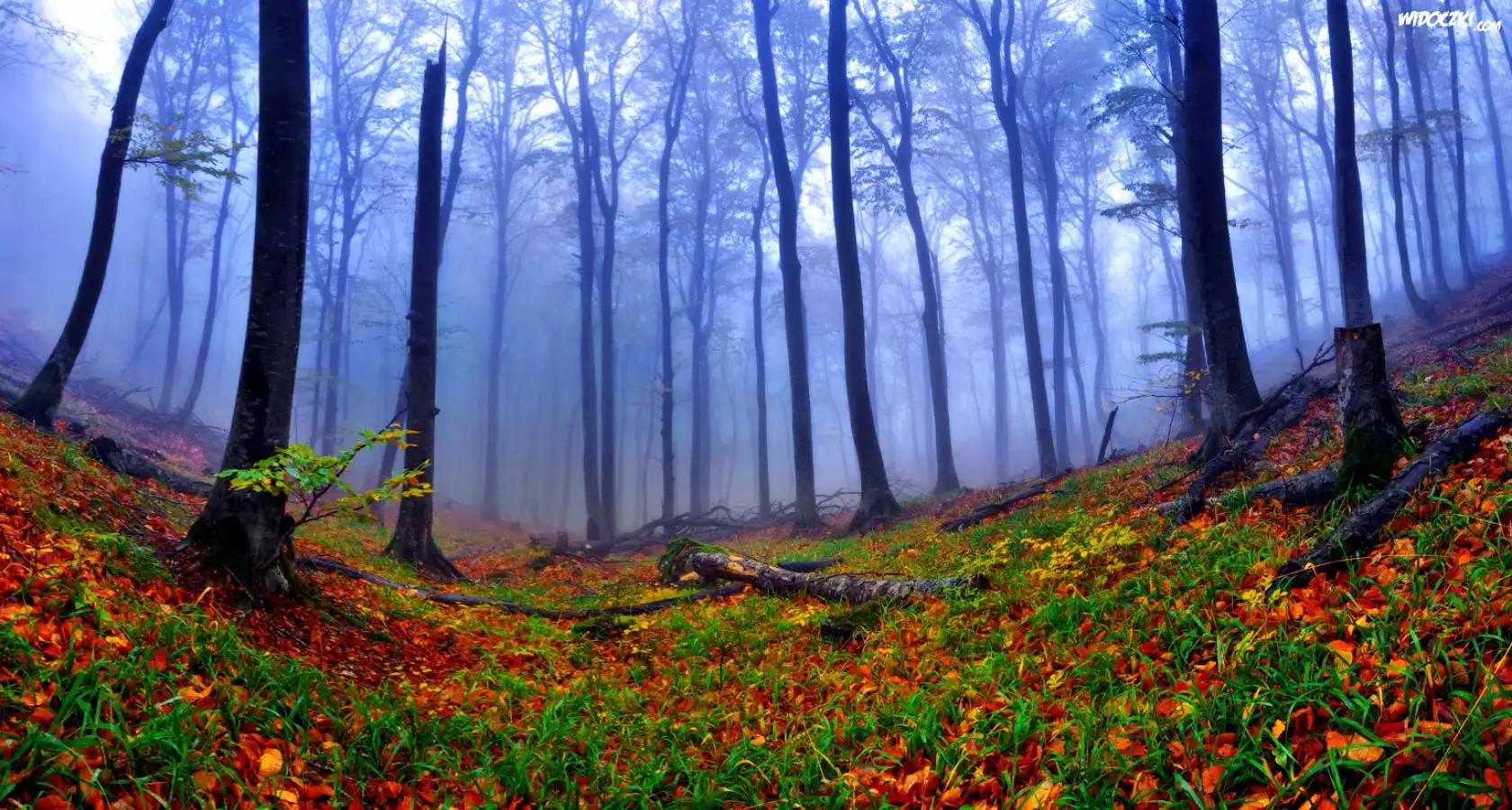 Zdjęcia, Las, Jesienne, Liście, Mgła