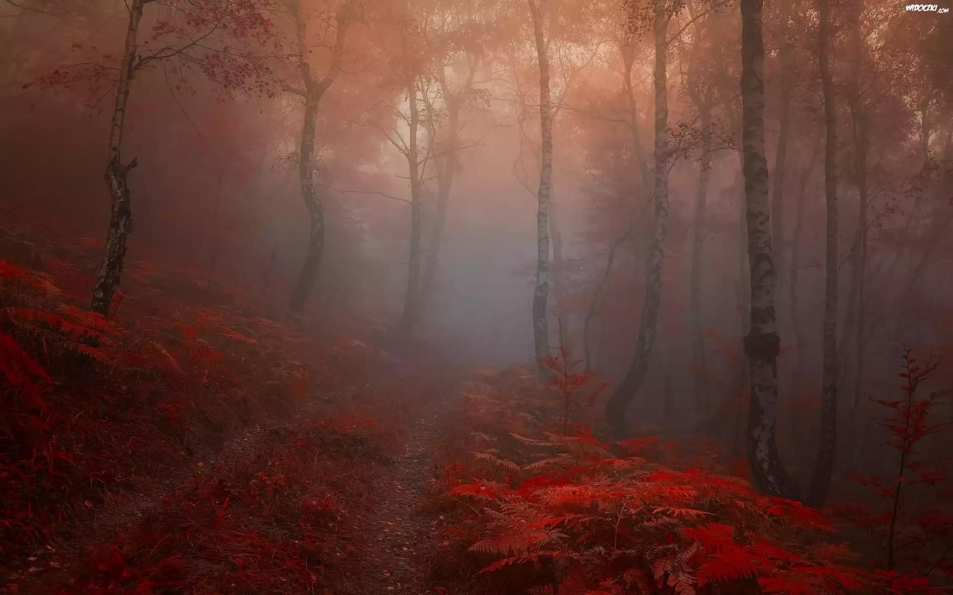 Zdjęcia, Las, Mgła, Liście, Ścieżka