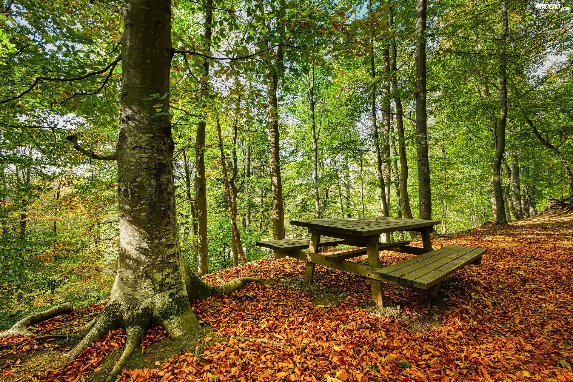 Zdjęcia, Las, Drzewa, Opadłe, Liście, Ławka