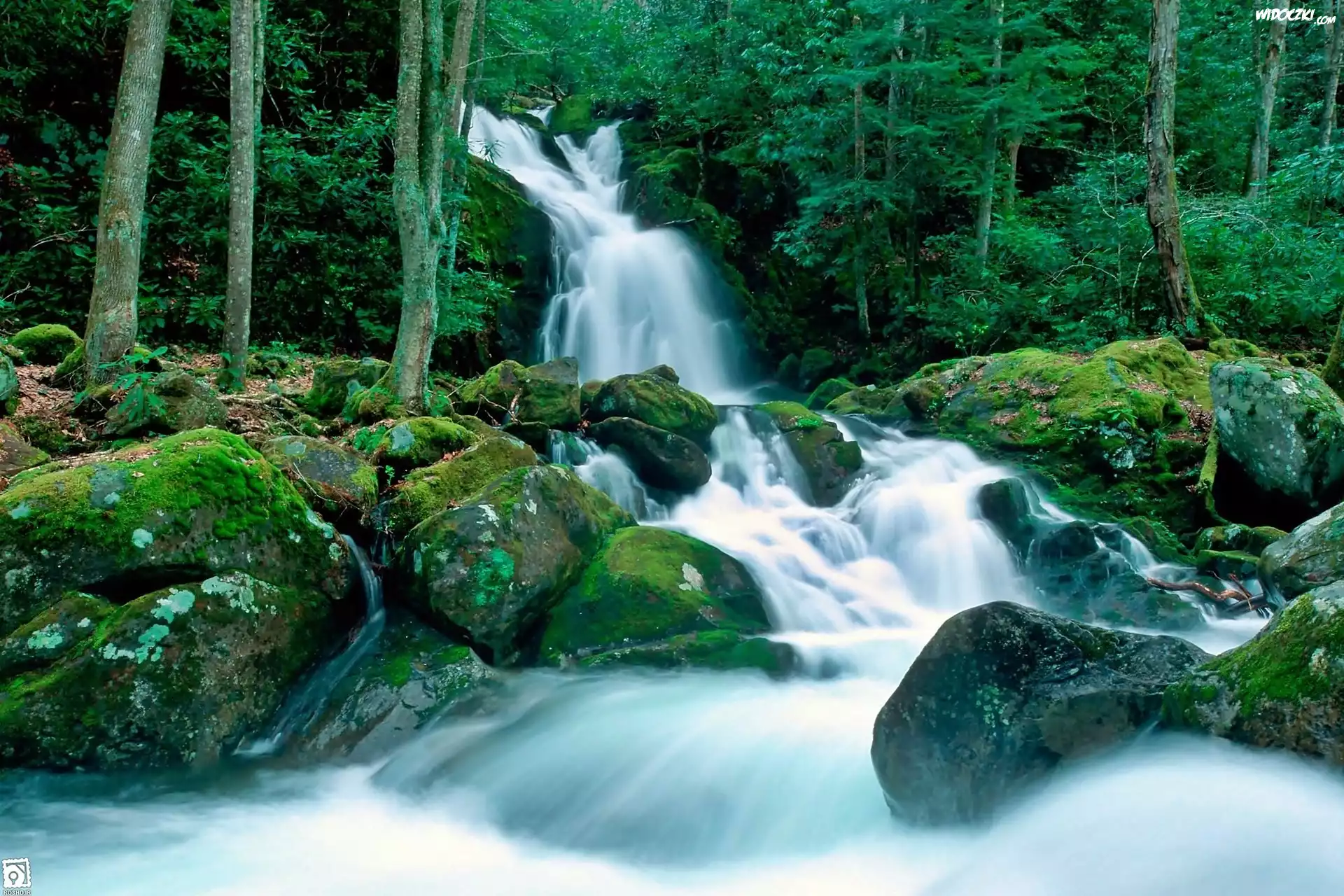 Zdjęcia, Las, Głazy, Mchy, Wodospad