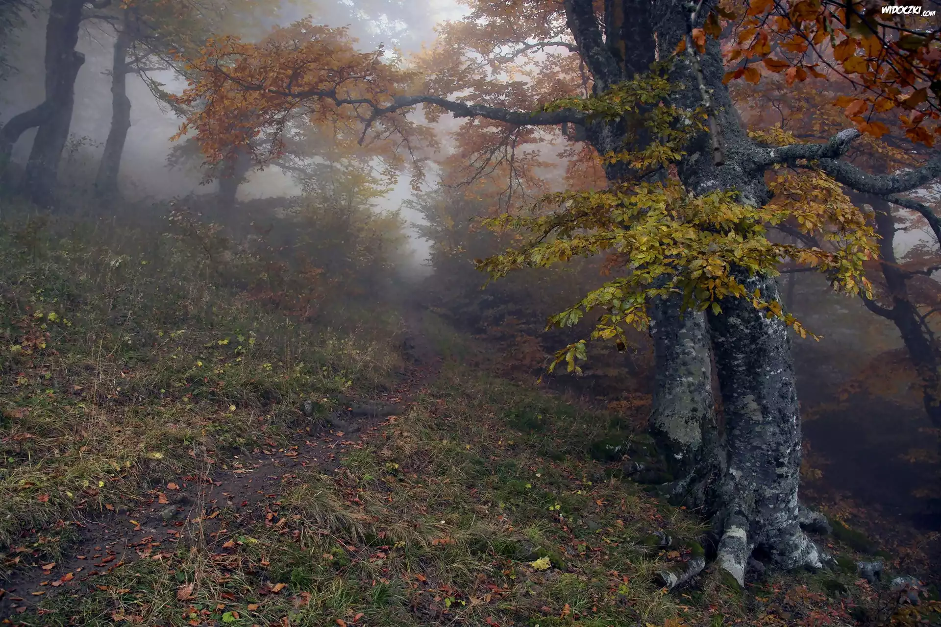 Zdjęcia, Las, Drzewa, Ścieżka, Mgła, Jesień
