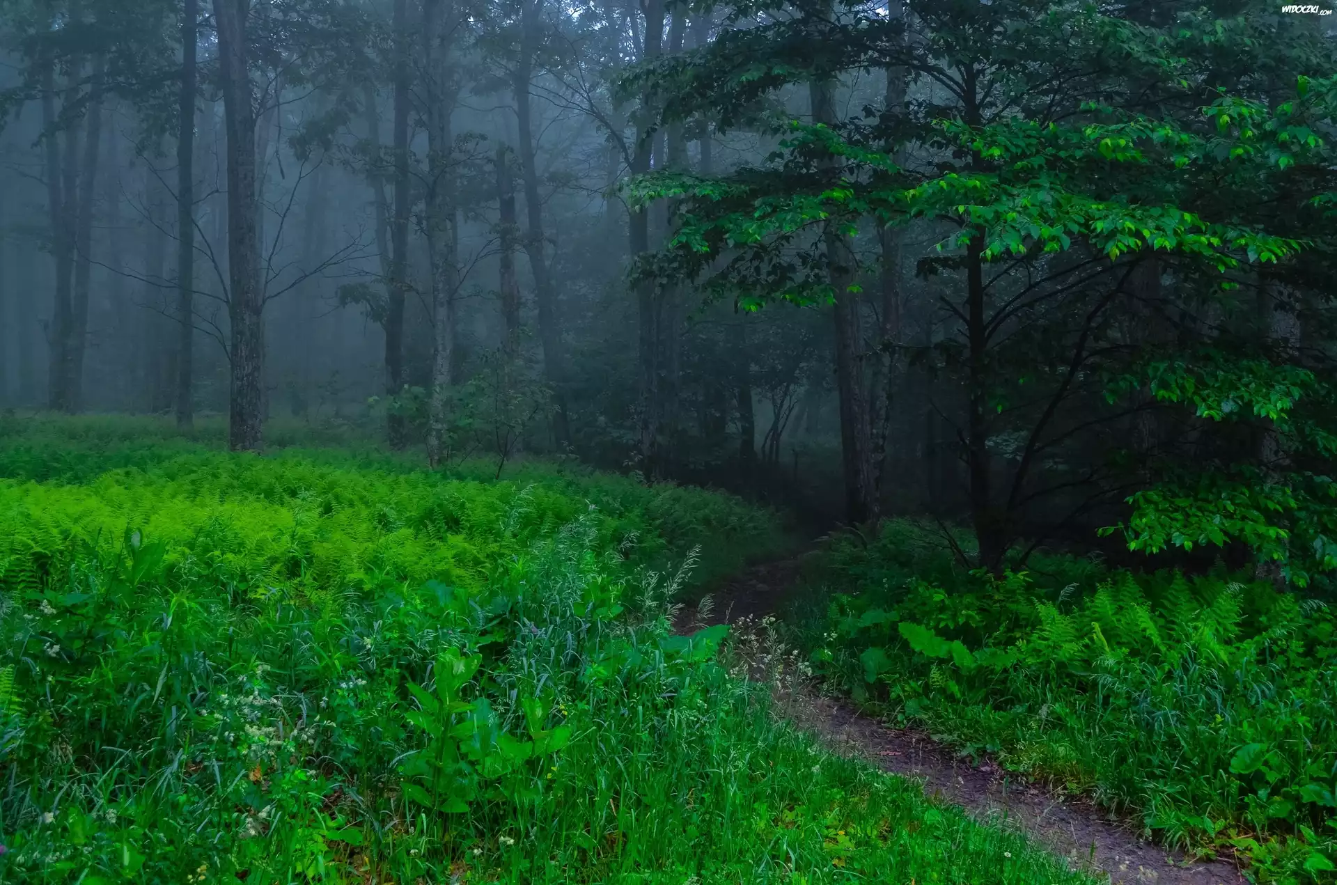 Zdjęcia, Las, Dróżka, Mgła, Paprocie