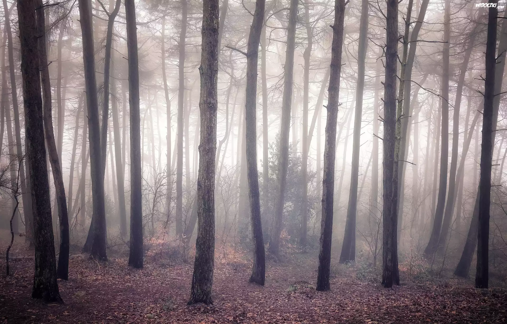 Zdjęcia, Las, Bezlistne, Drzewa, Mgła, Jesień