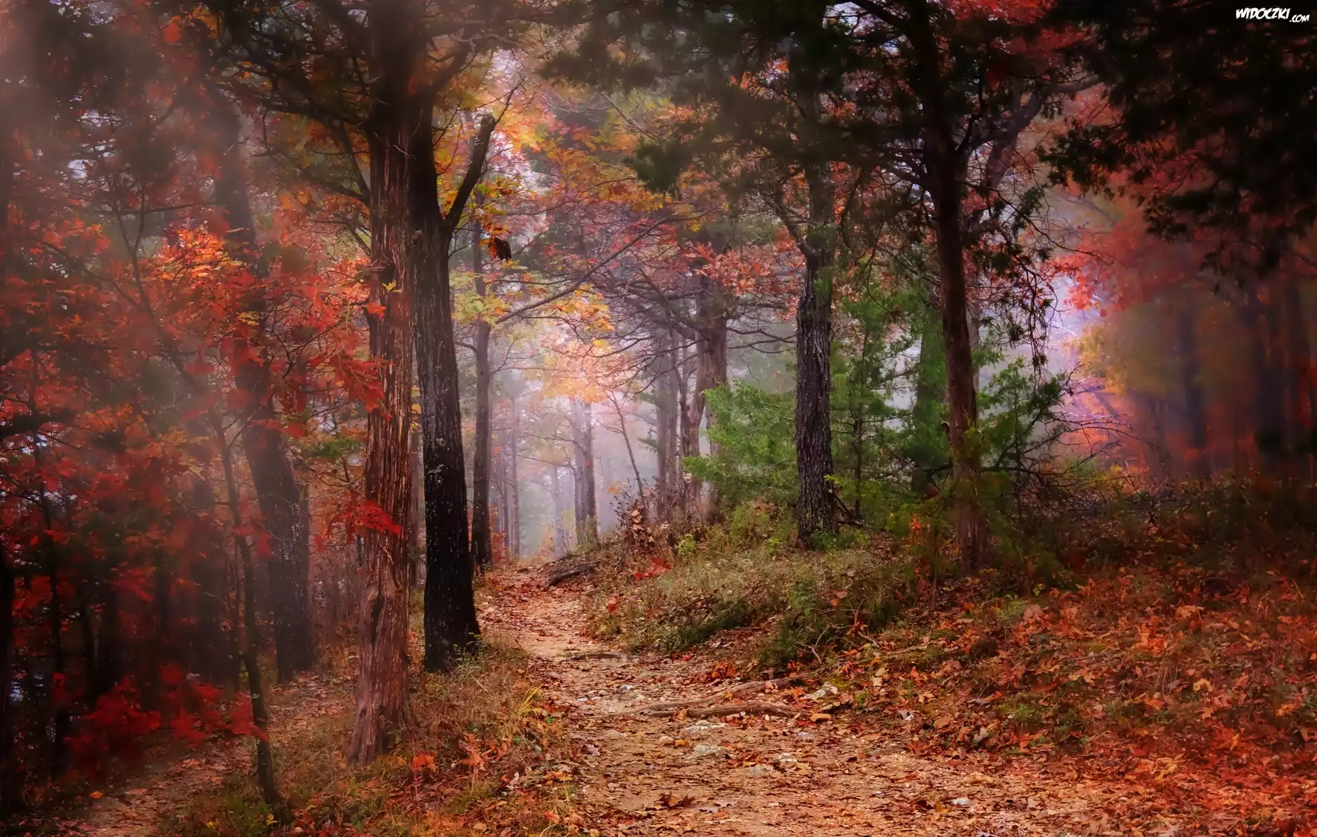 Zdjęcia, Las, Ścieżka, Drzewa, Mgła, Jesień
