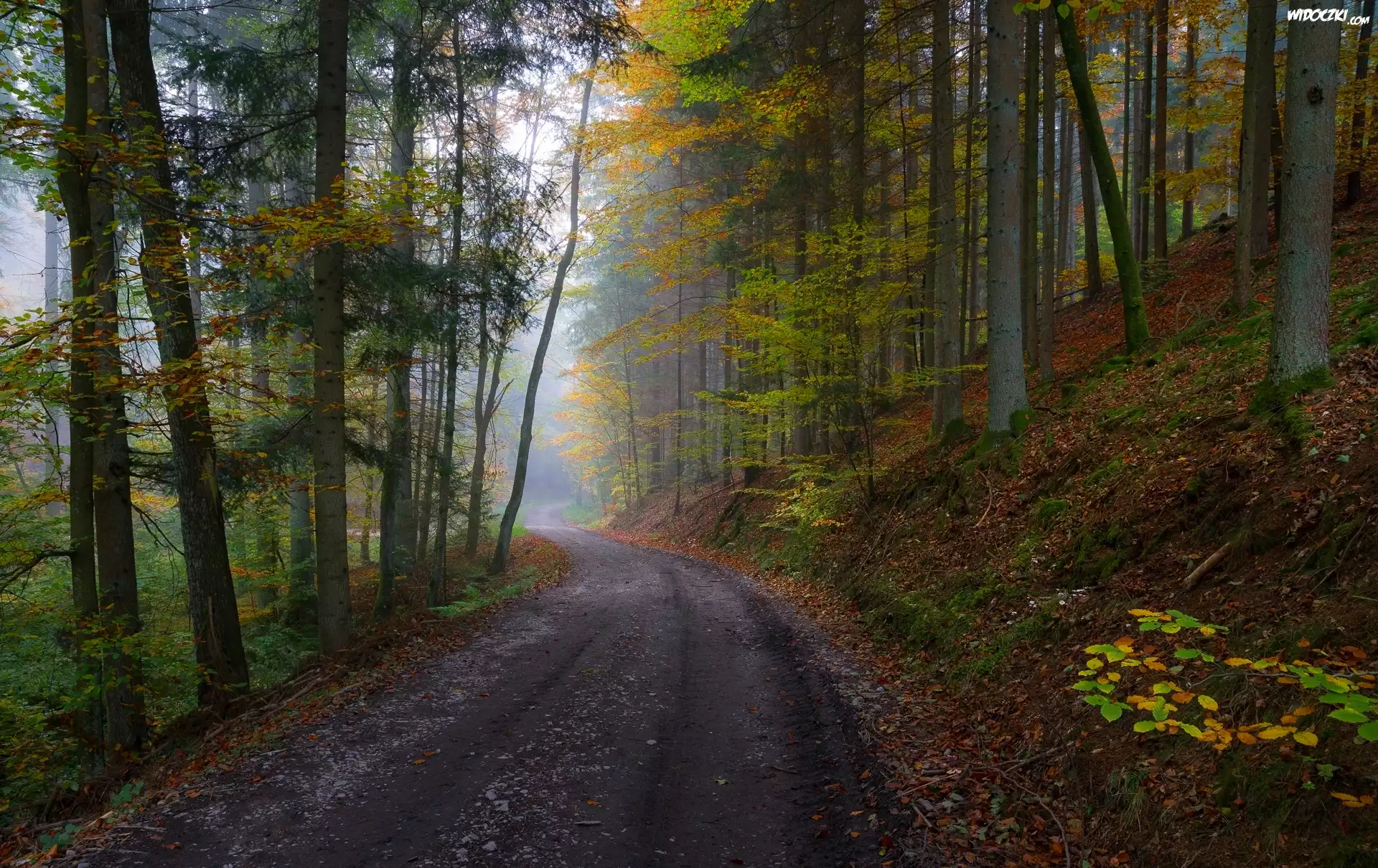 Zdjęcia, Las, Droga, Drzewa, Mgła, Jesień