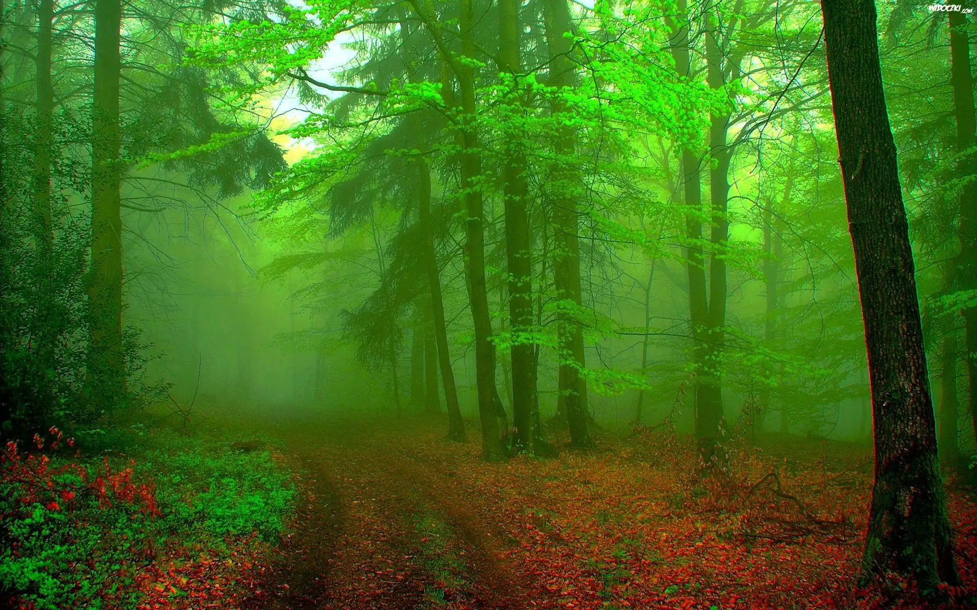 Zdjęcia, Las, Drzewa, Mgła, Jesień