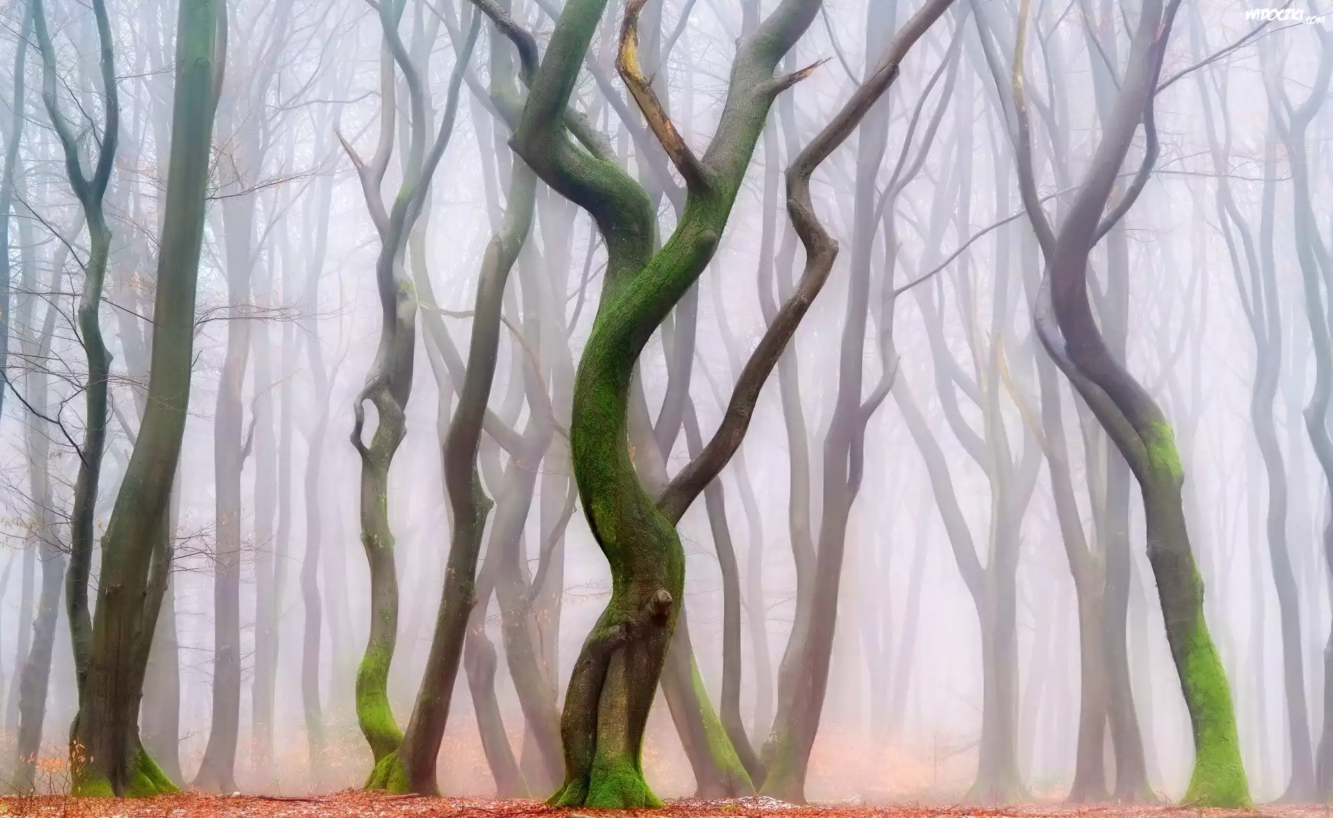 Zdjęcia, Las, Wygięte, Drzewa, Mgła, Jesień
