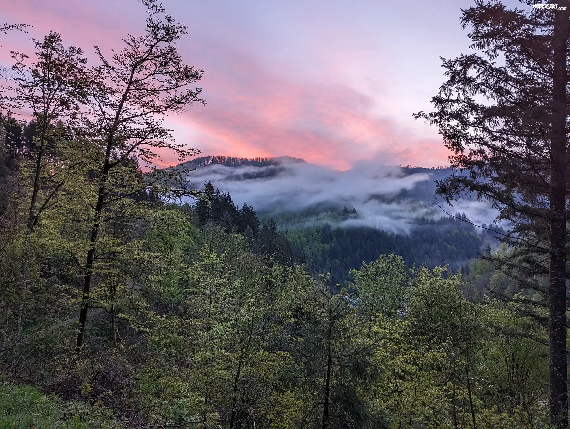 Zdjęcia, Drzewa, Las, Mgła, Niebo, Góry
