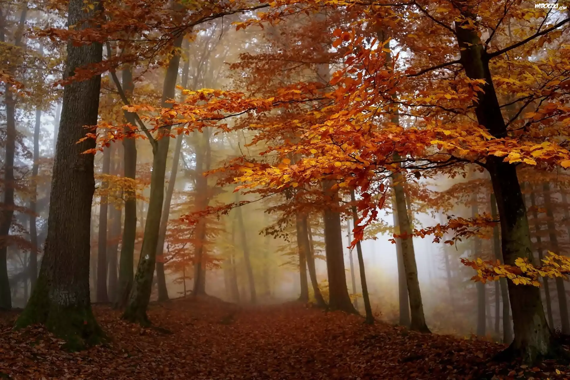 Zdjęcia, Las, Droga, Liście, Mgła, Jesień
