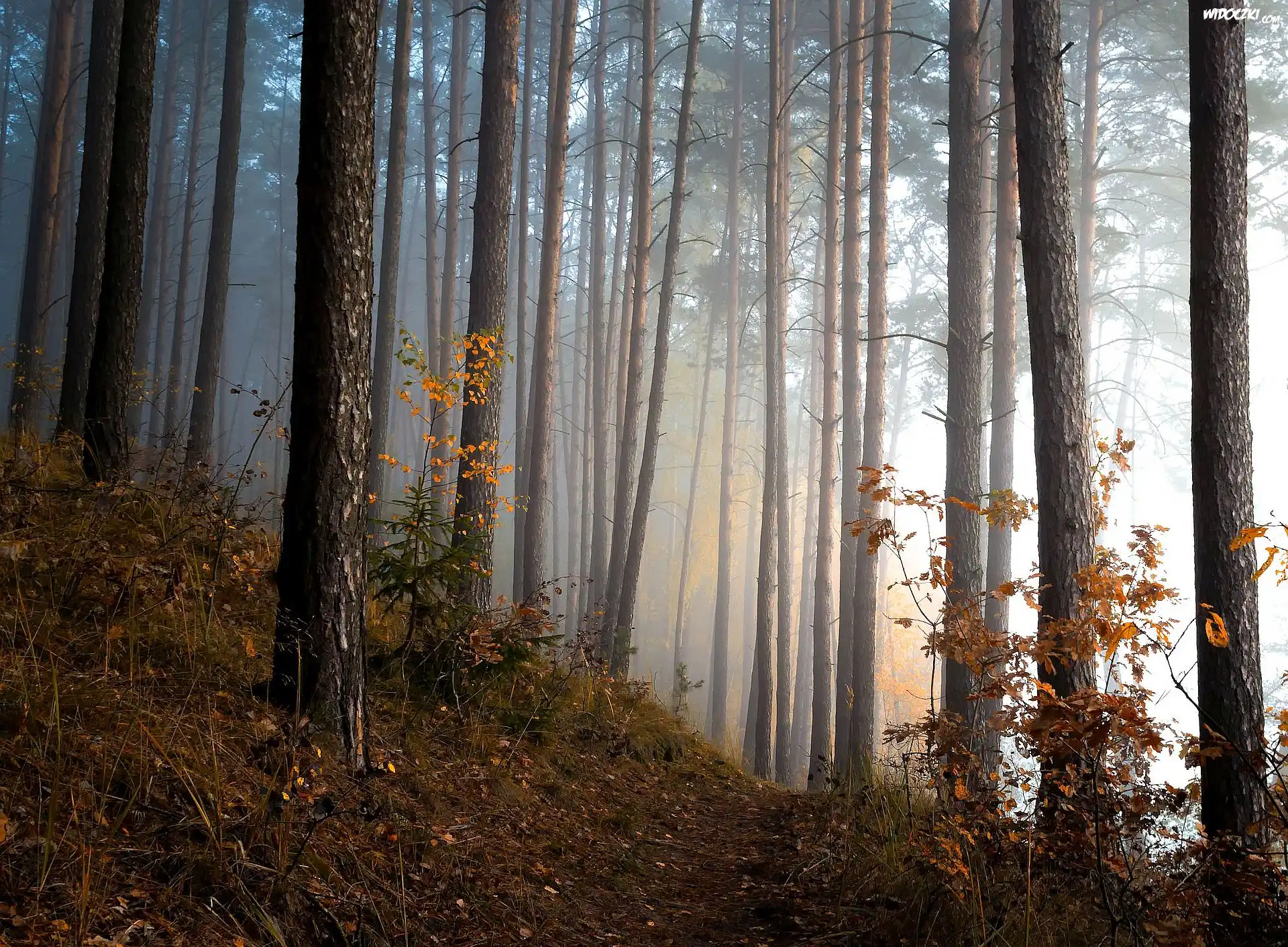 Zdjęcia, Las, Ścieżka, Poranek, Mgła, Jesień