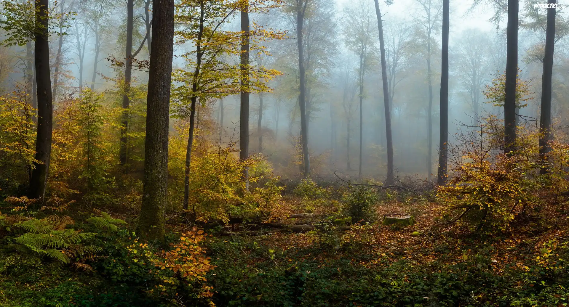 Zdjęcia, Las, Drzewa, Rośliny, Mgła, Jesień