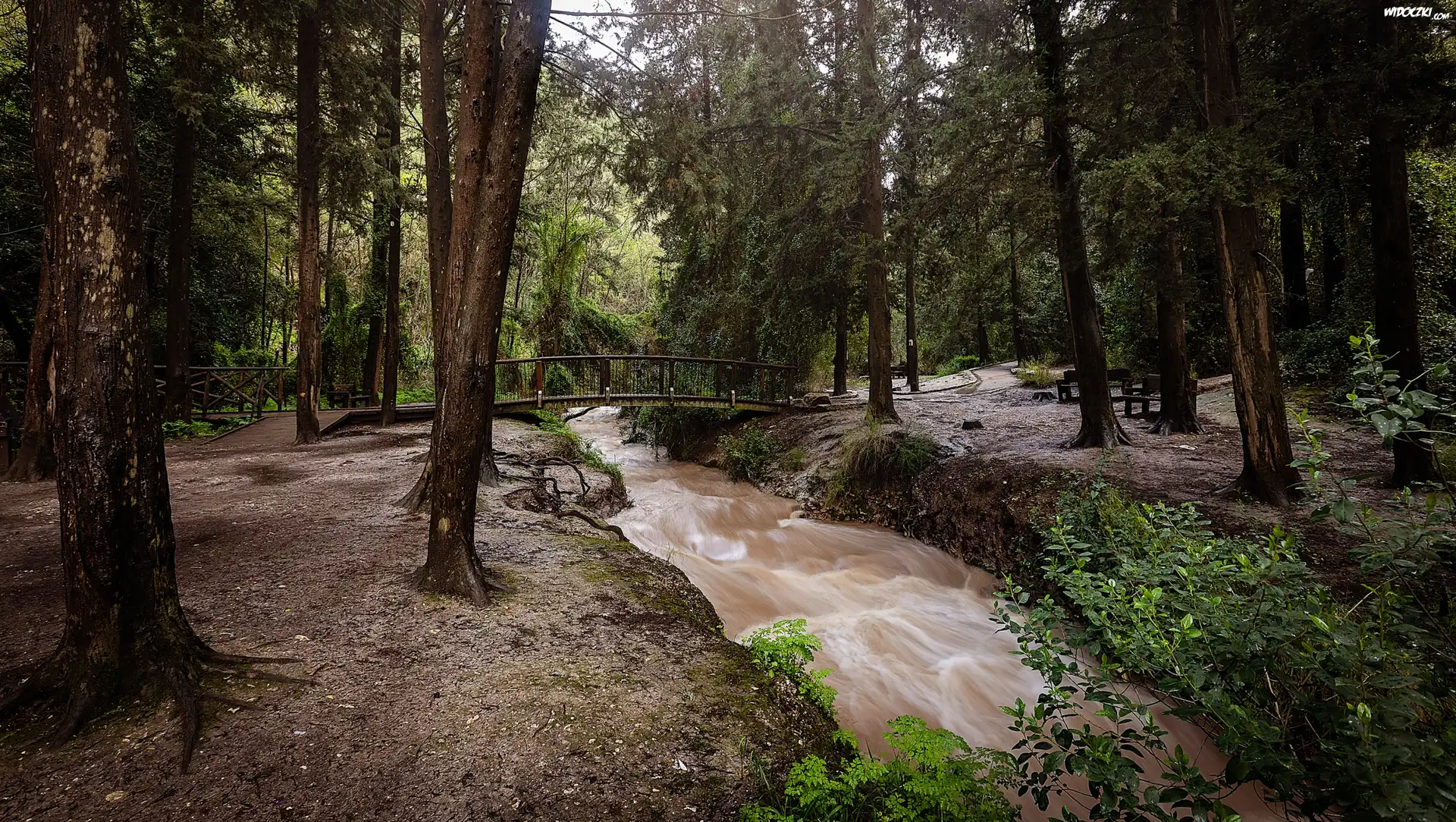 Zdjęcia, Las, Drzewa, Mostek, Rzeka