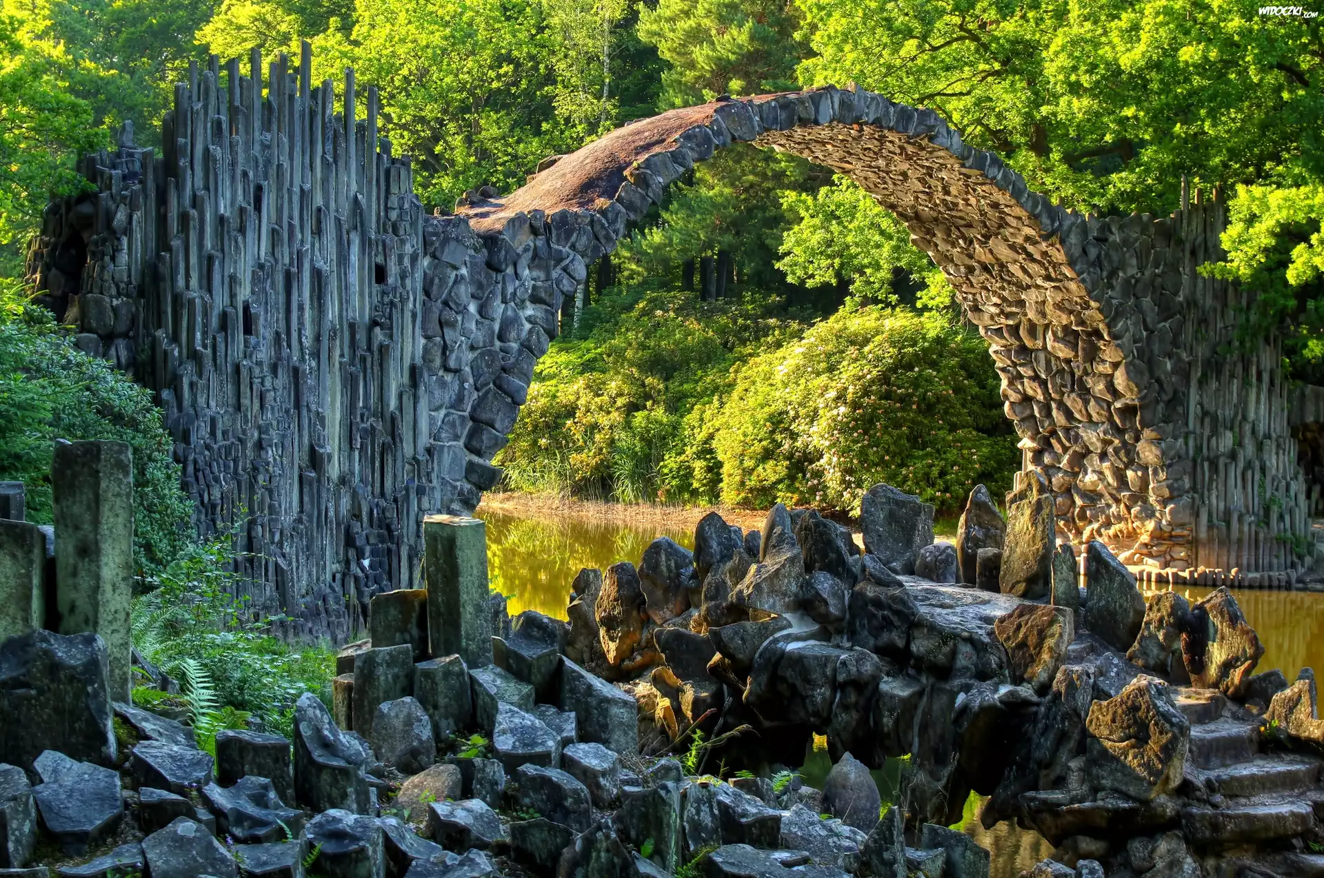 Zdjęcia, Las, rzeka, Mostek, Kamienie
