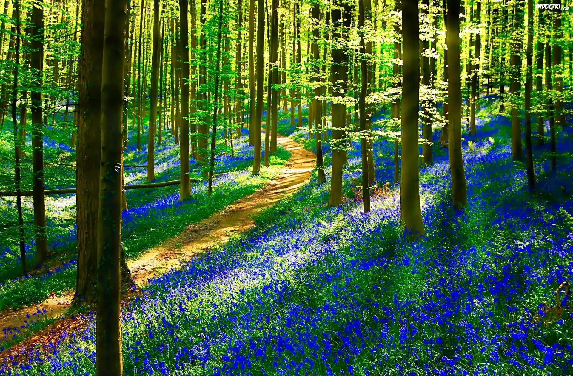 Zdjęcia, Las, Dróżka, Niebieskie, Kwiaty
