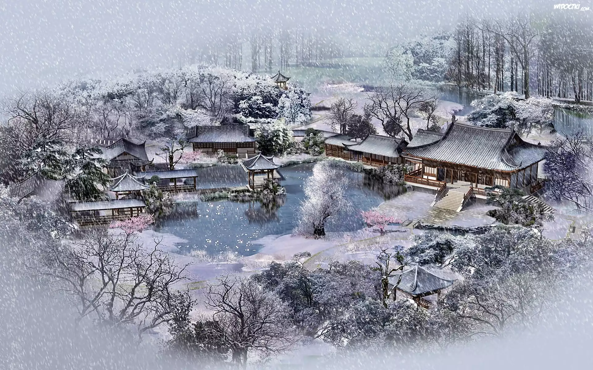 Zima, Las, Jezioro, Chiński, Ogród, Domy, Padający, Śnieg