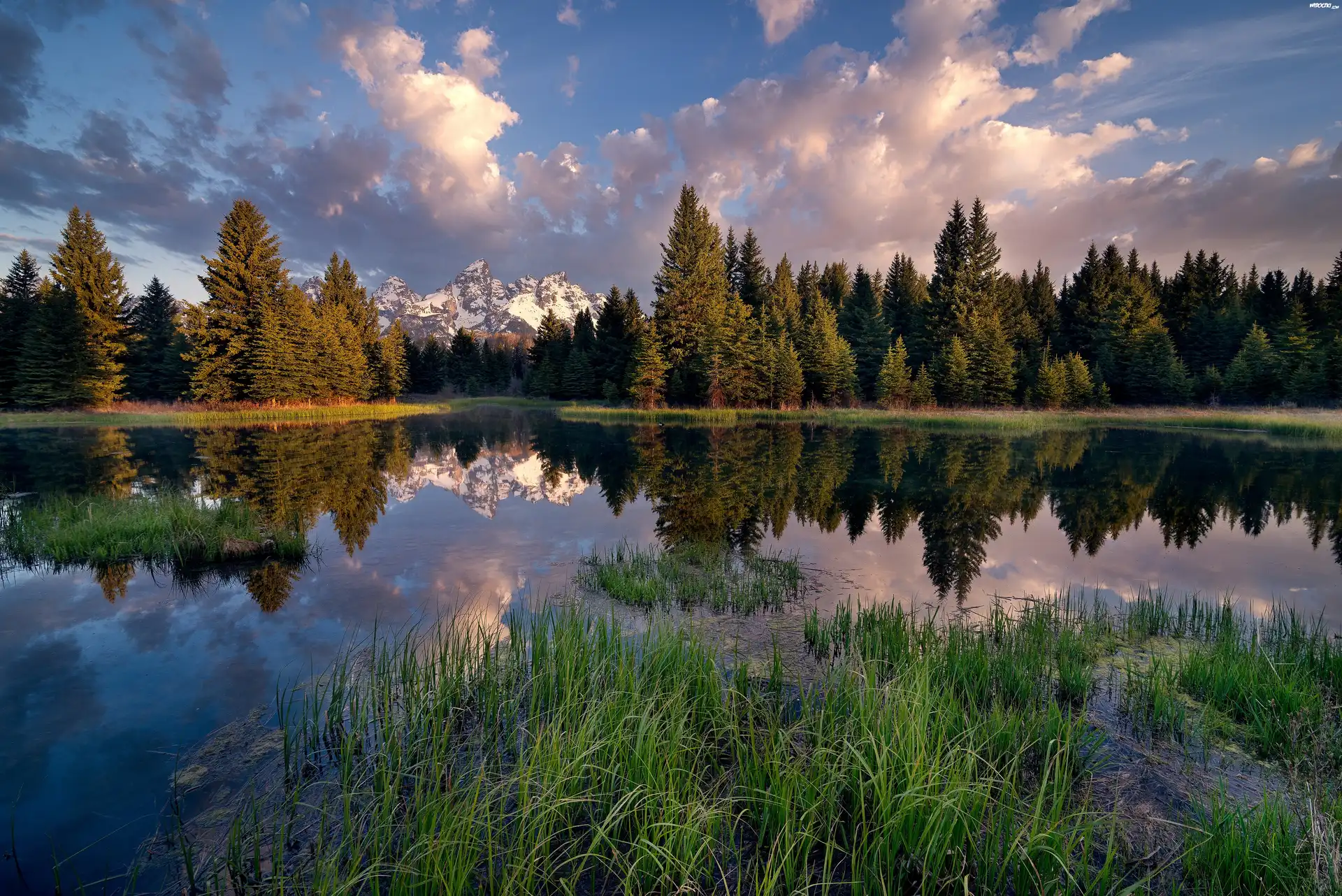 Zdjęcia, Las, Jezioro, Szuwary, Obłoki, Odbicie