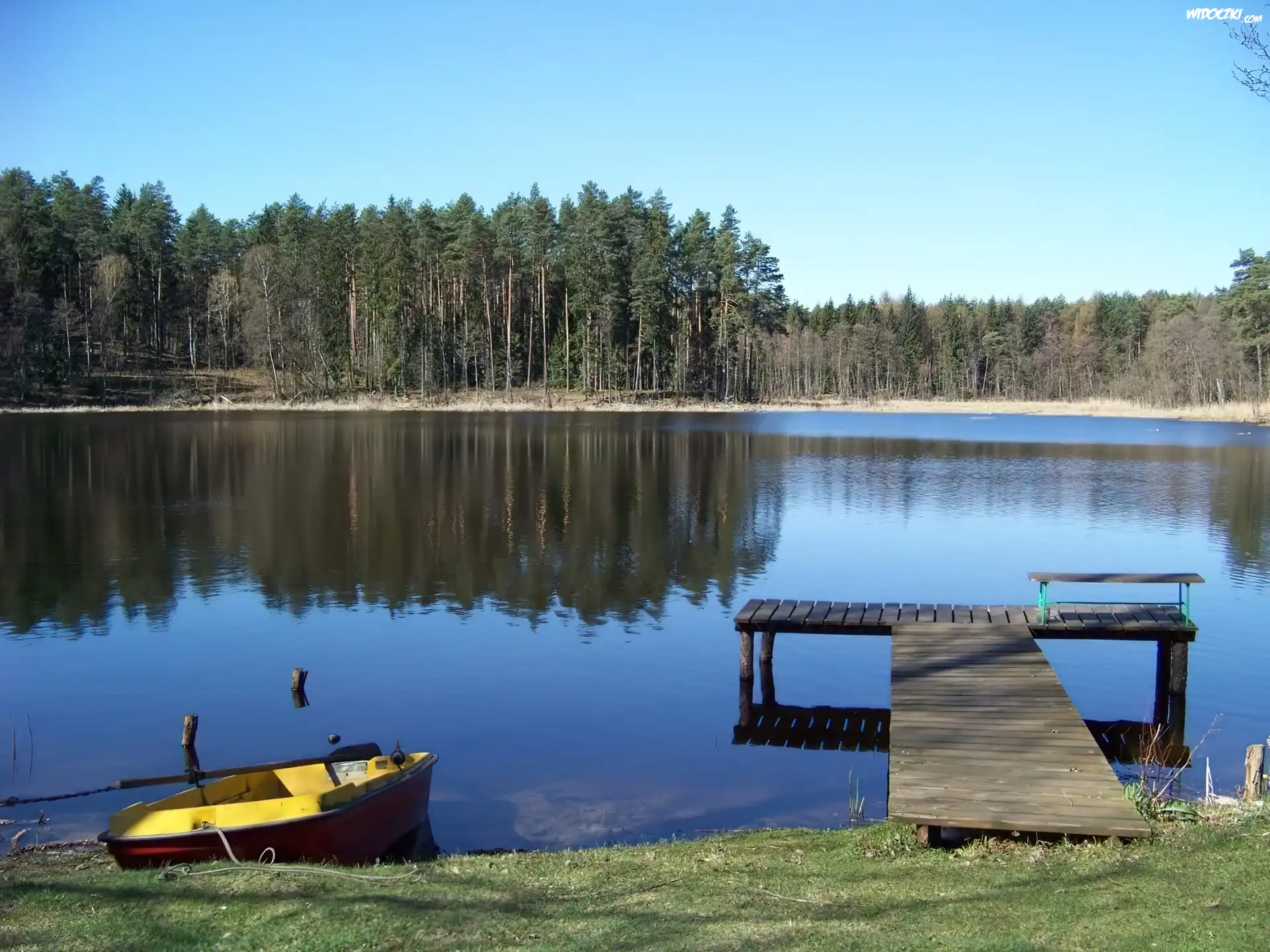 Zdjęcia, Las, Jezioro, Pomost, Łódka, Odbicie