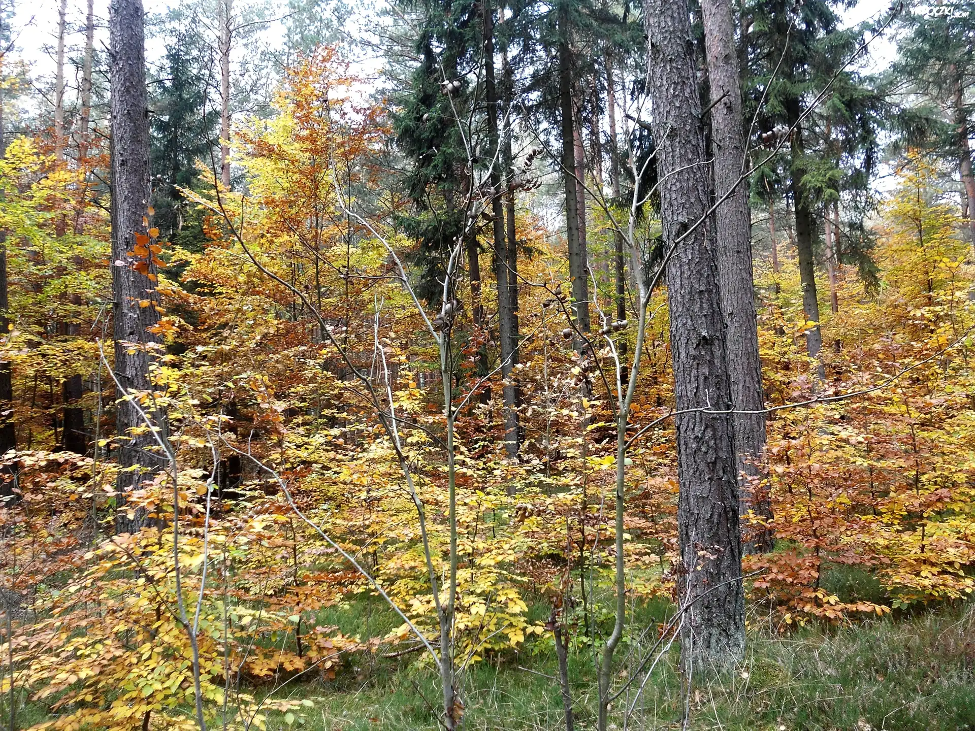 Las, Jesień, Drzewa, Żółte, Liście