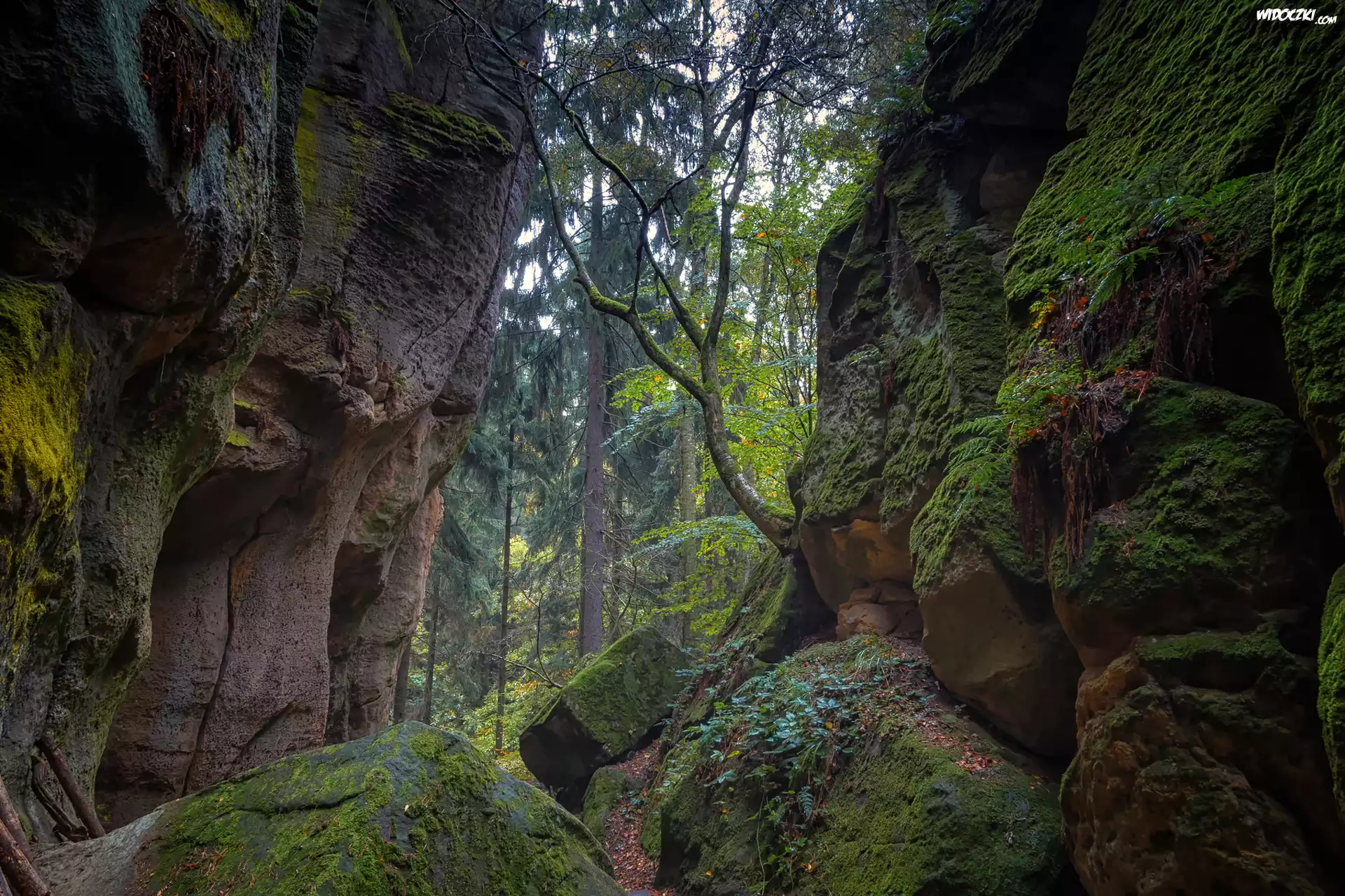 Zdjęcia, Las, Drzewa, Omszałe, Skały