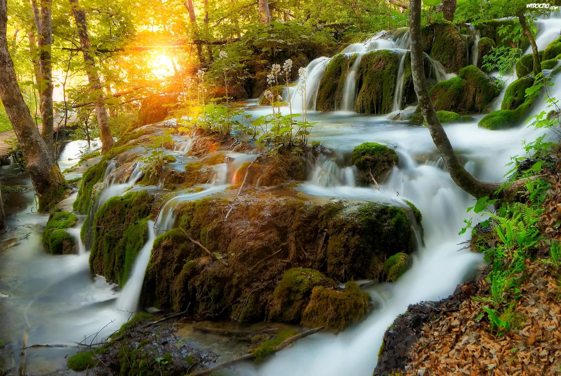 Zdjęcia, Las, Wodospad, Kaskada, Omszałe, Skały