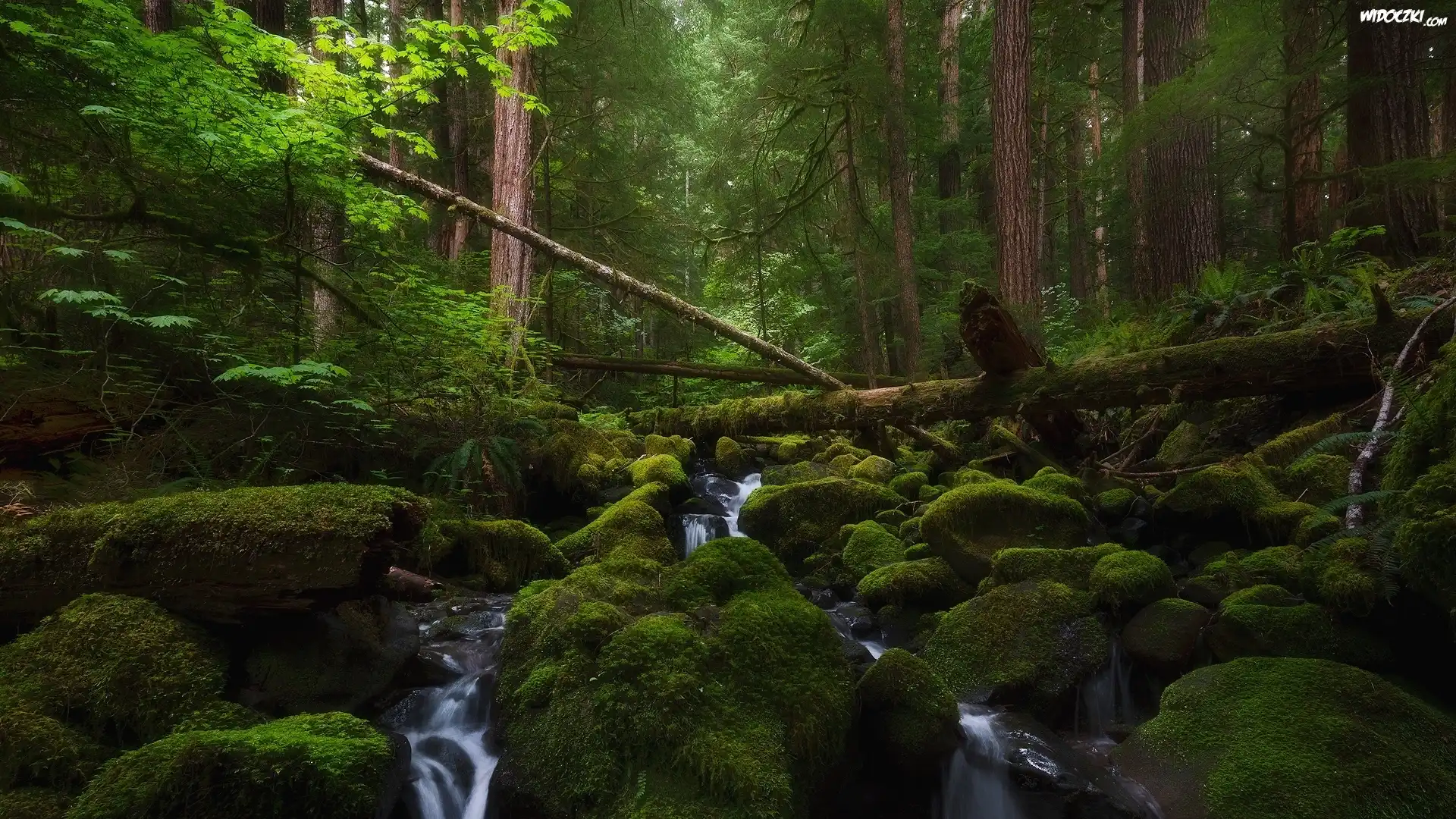 Las, Strumyk, Kamienie, Omszałe, Pnie, Kłody, Olympic Park Narodowy, Stan Waszyngton, Stany Zjednoczone |
